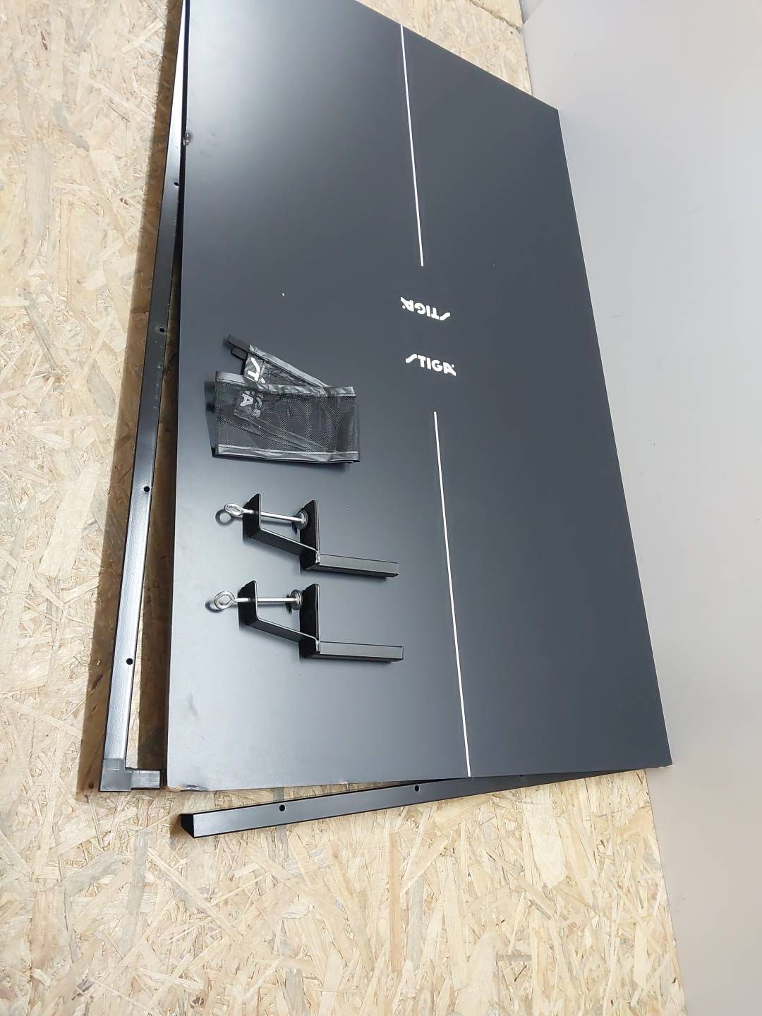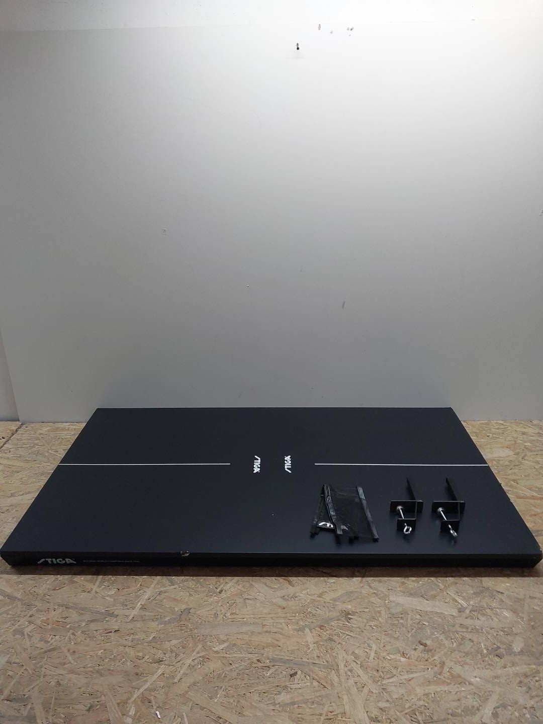 Stół do tenisa stołowego ma pochyłe krawędzie, płytę pilśniową o grubości 12 mm z wysokiej jakości wykończeniem i wytrzymałą siatkę nylonową – wszystko w kolorze czarnym.