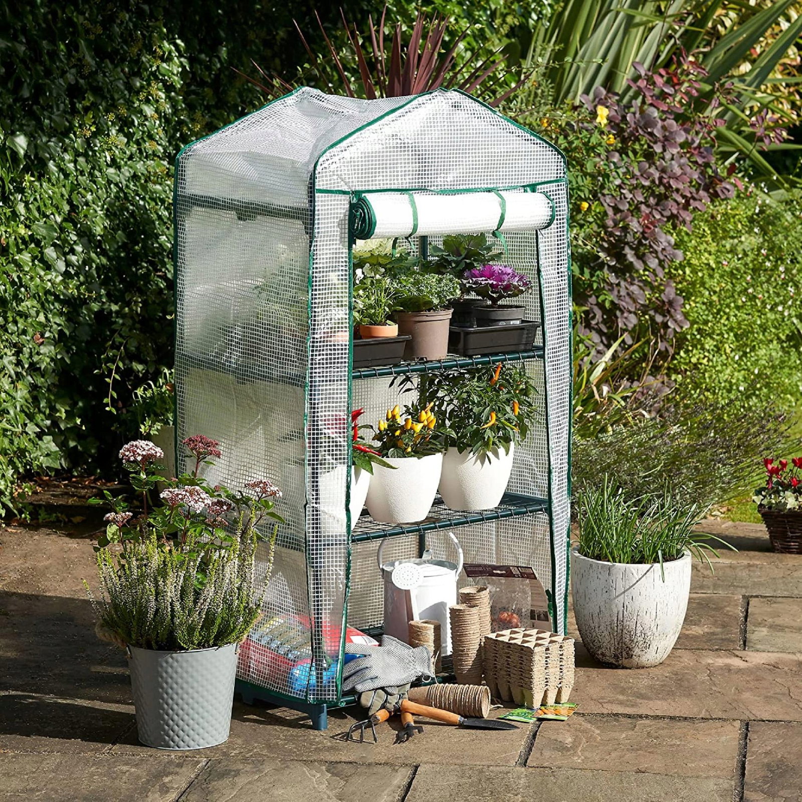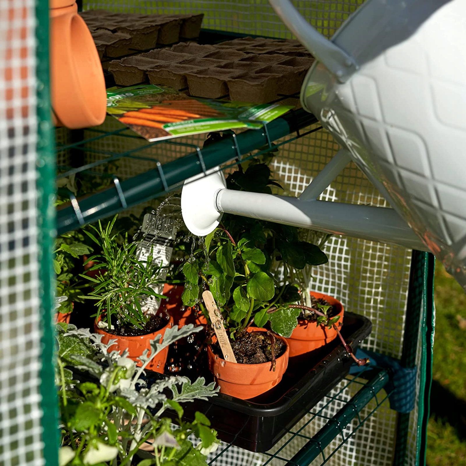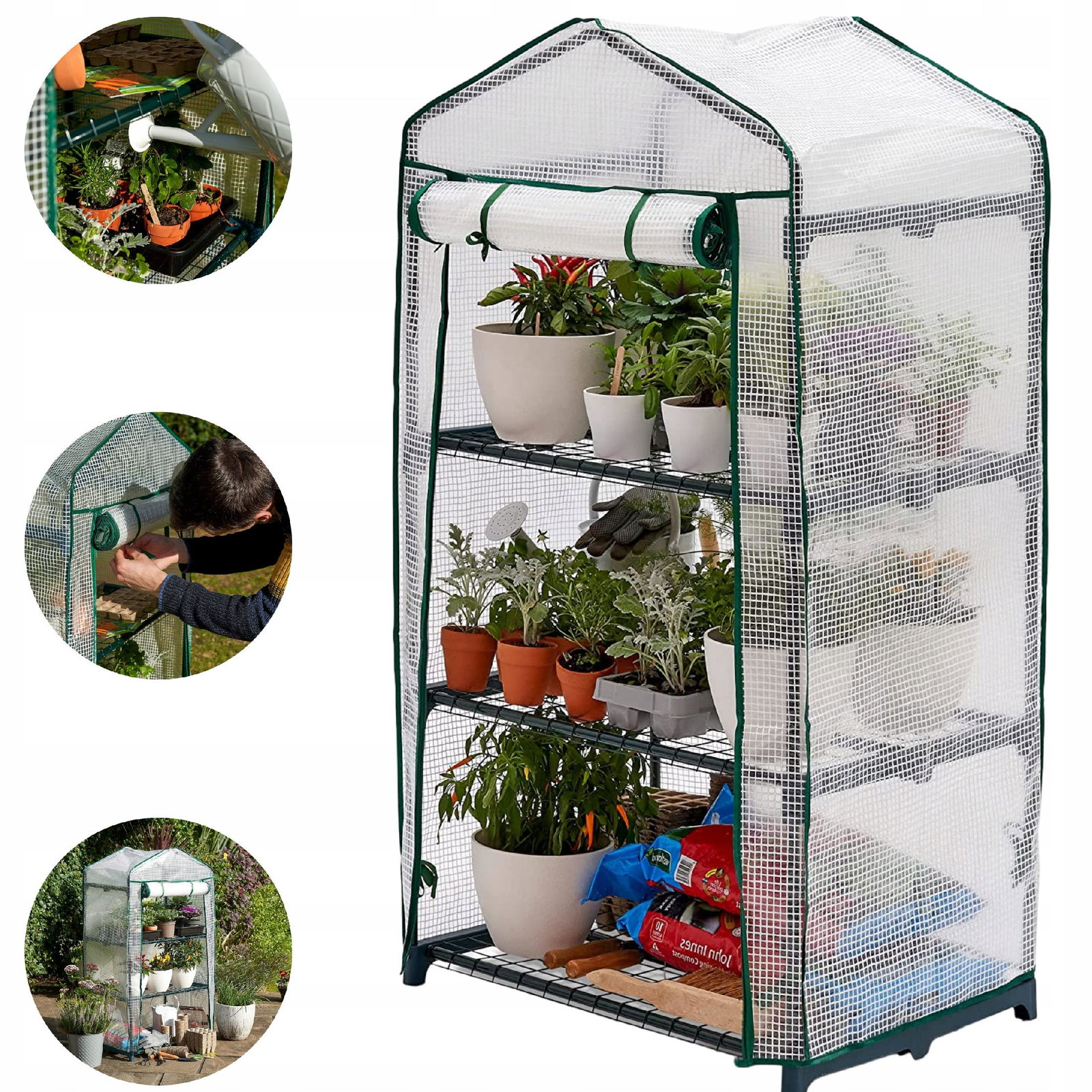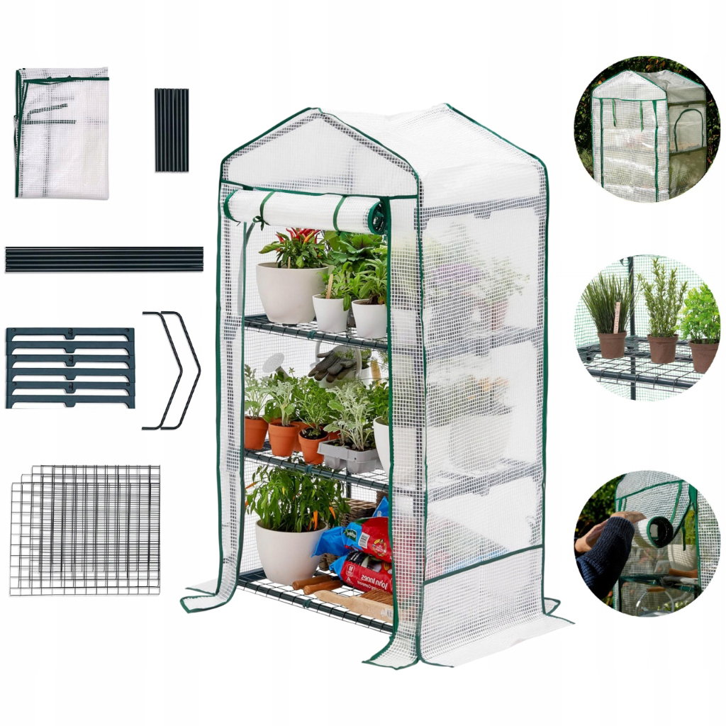 - Szklarnia ma trzy regulowane półki, na których możesz ustawić doniczki, skrzynki lub tacki z roślinami.