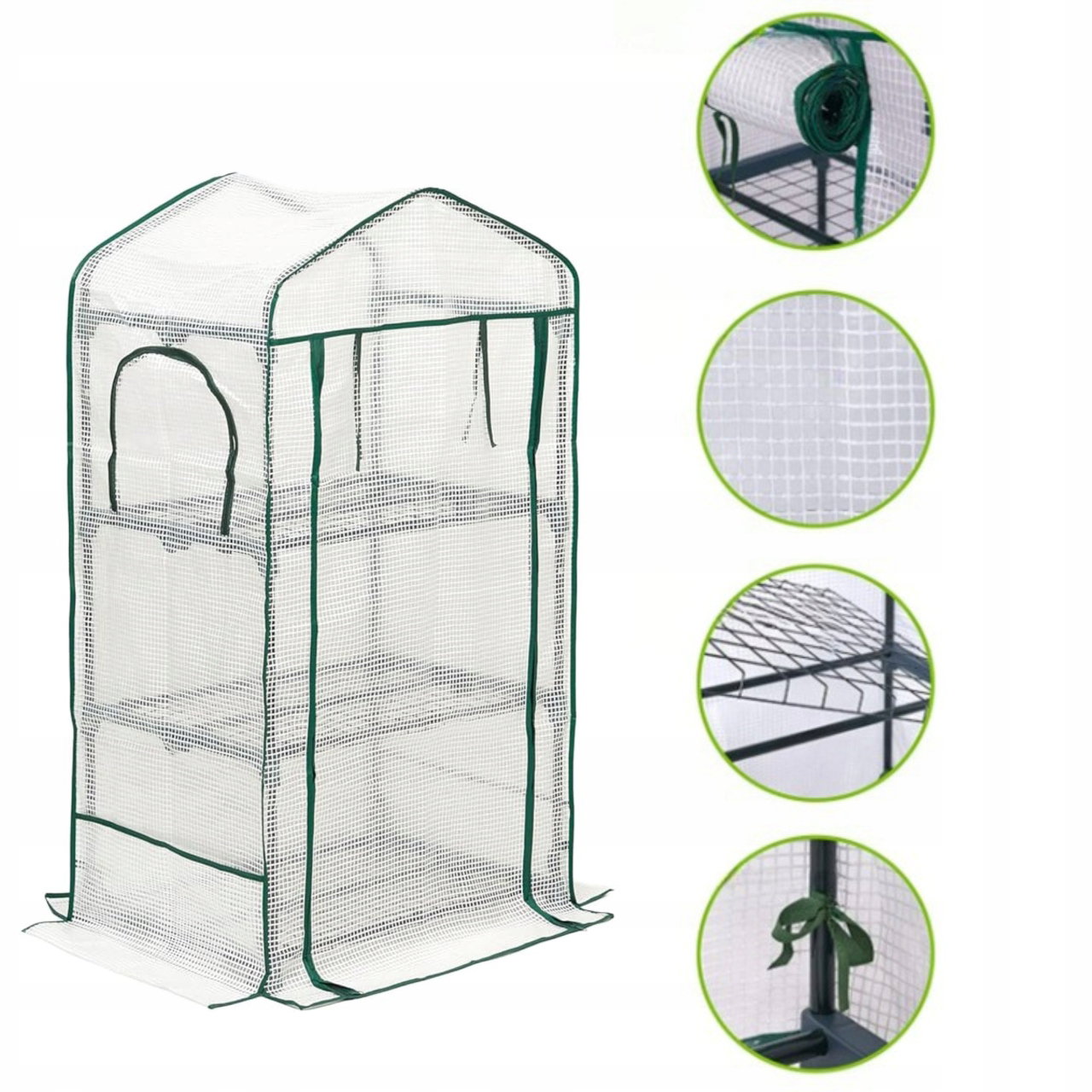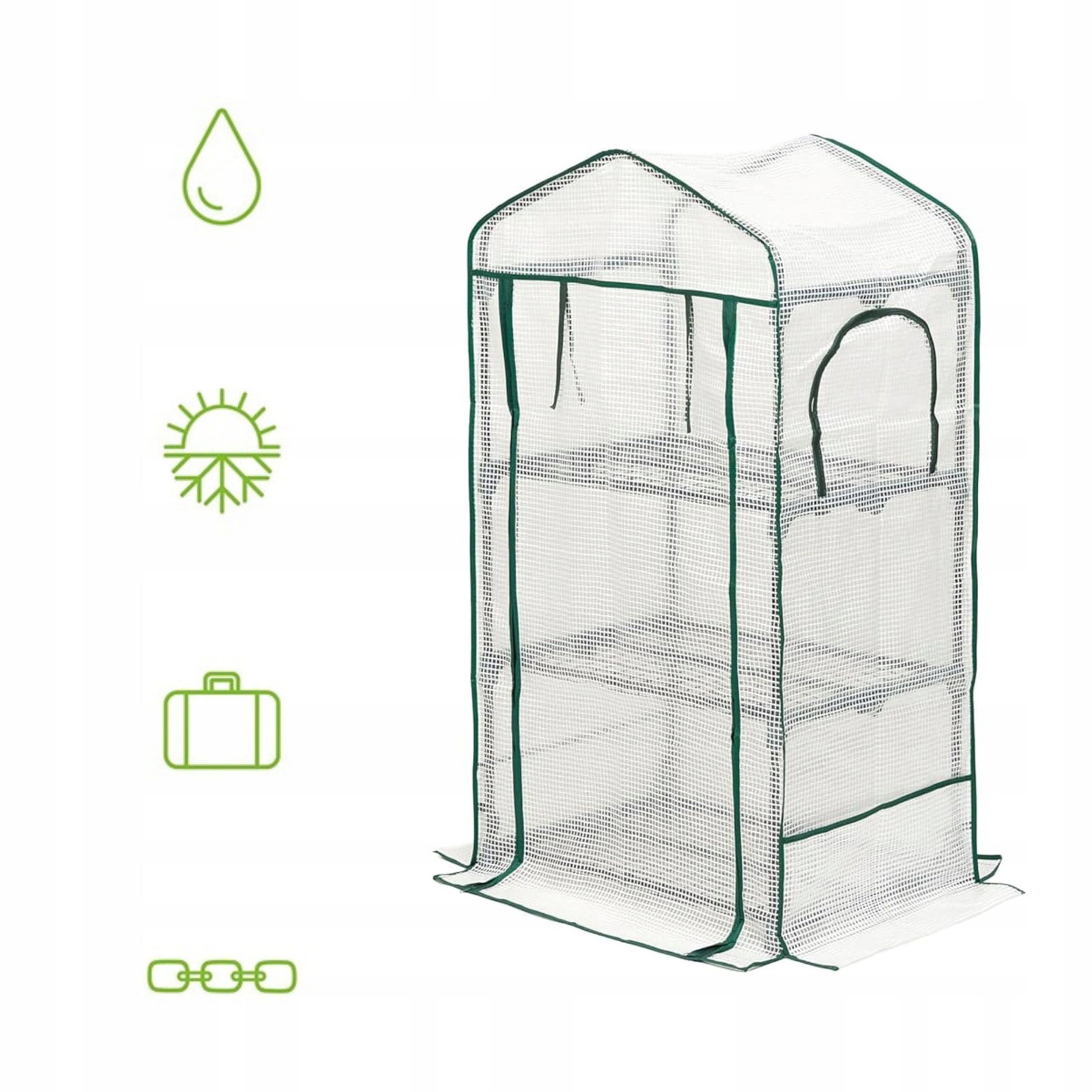 - Szklarnia ma solidną konstrukcję i trwałą folię zamykaną na zamek błyskawiczny.