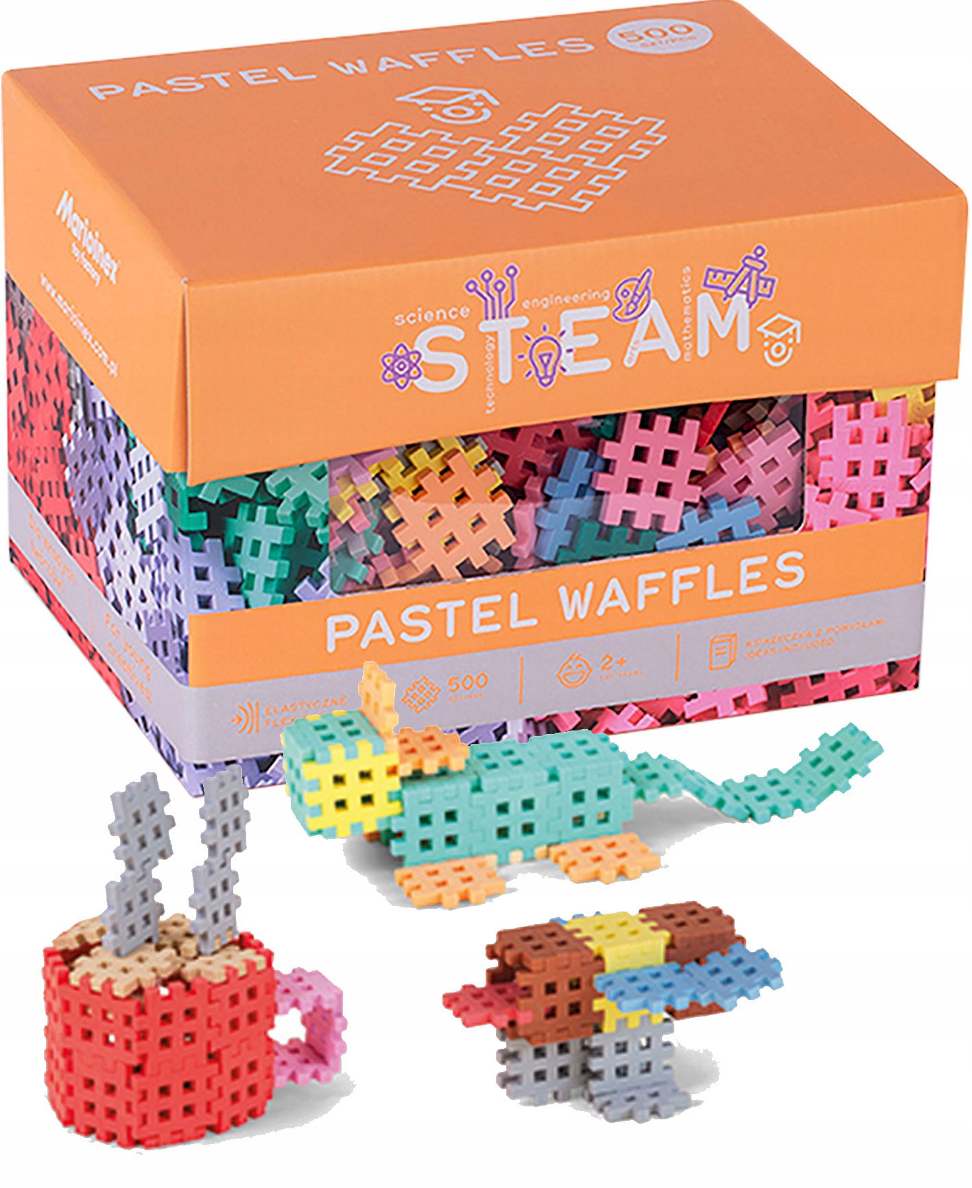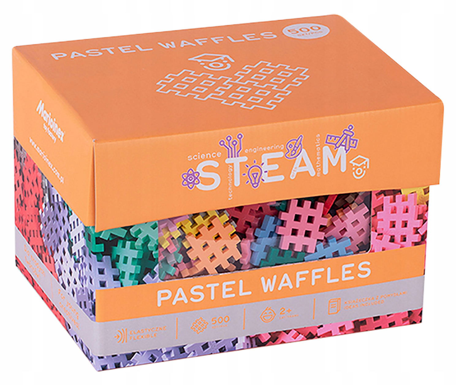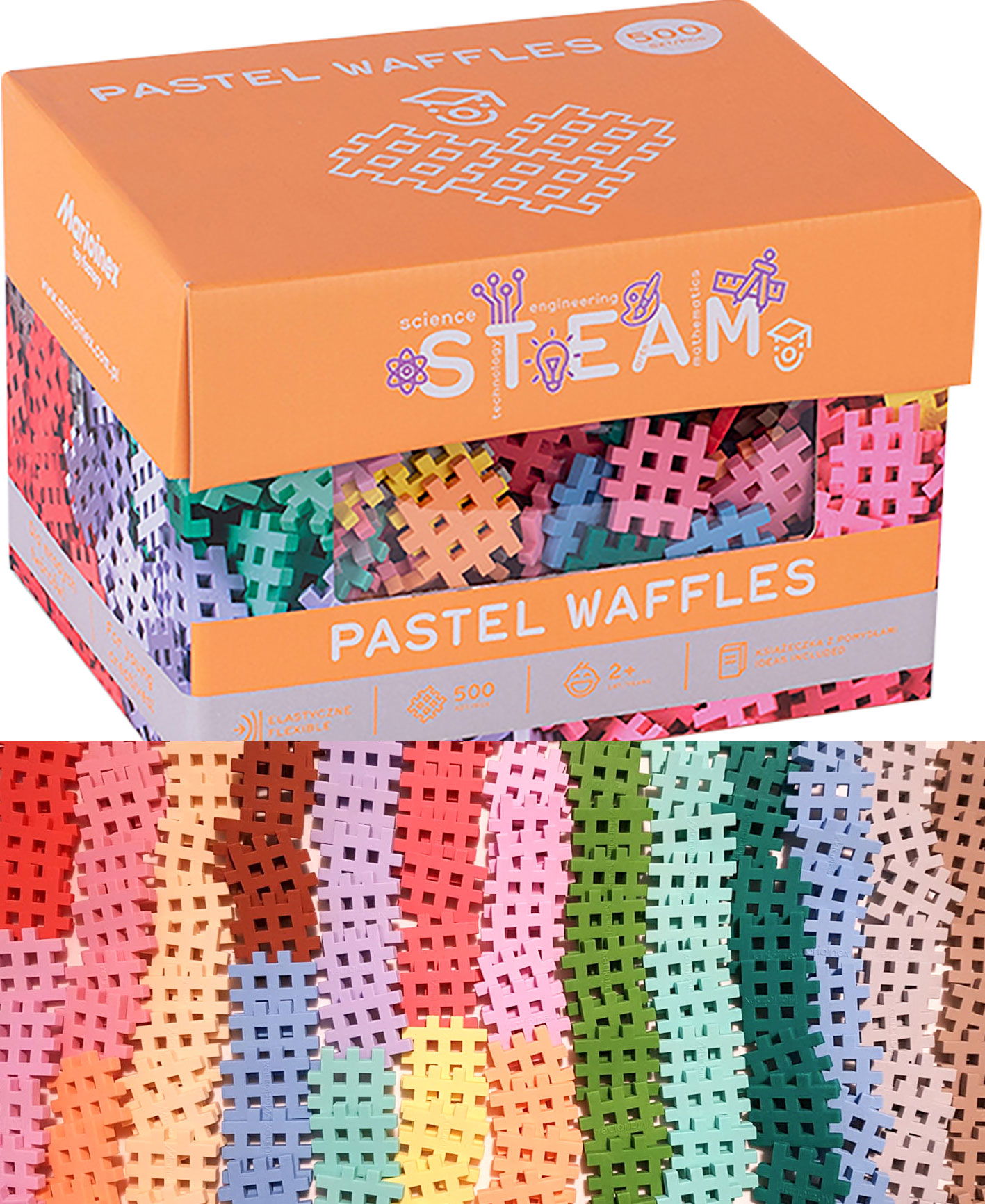 Pastel Waffle powstały z myślą o małych konstruktorach i nowym wymiarze zabawy. Całkiem nowa odsłona klasycznych Waffli, uzupełniona subtelną kolorystyką, która w połączeniu ze standardowymi odcieniami daje nowe spektrum twórczej i inspirującej zabawy. Opakowanie dodatkowo wzbogaciliśmy 10 kartami edukacyjnymi, które bazują na wiedzy matematycznej. Karty edukacyjne zawierają szereg ćwiczeń uczą dzieci przez zabawę.