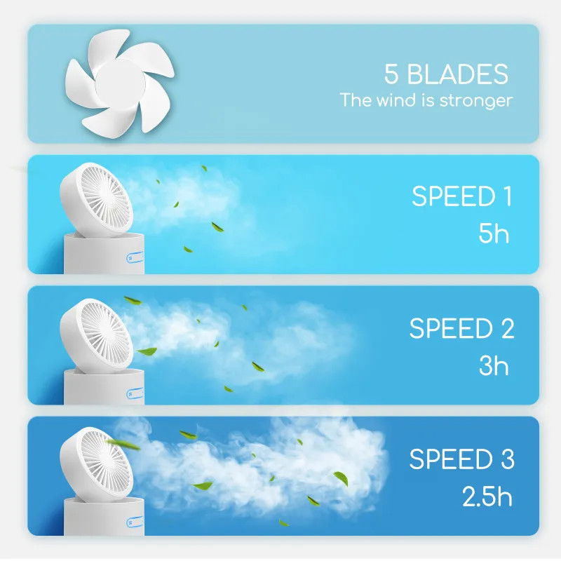 Drobna mgiełka, nawilżanie i chłodzenie. Możliwość regulacji prędkości wiatru na 3 biegach, sterowanie jednym klawiszem. Nocne oświetlenie w 7 kolorach. Wentylator można obracać w pionie , a powietrze jest dostarczane pod różnymi kątami, kierunek wiatru jest pod Twoją kontrolą. Mini, składany i przenośny, łatwy do przechowywania.