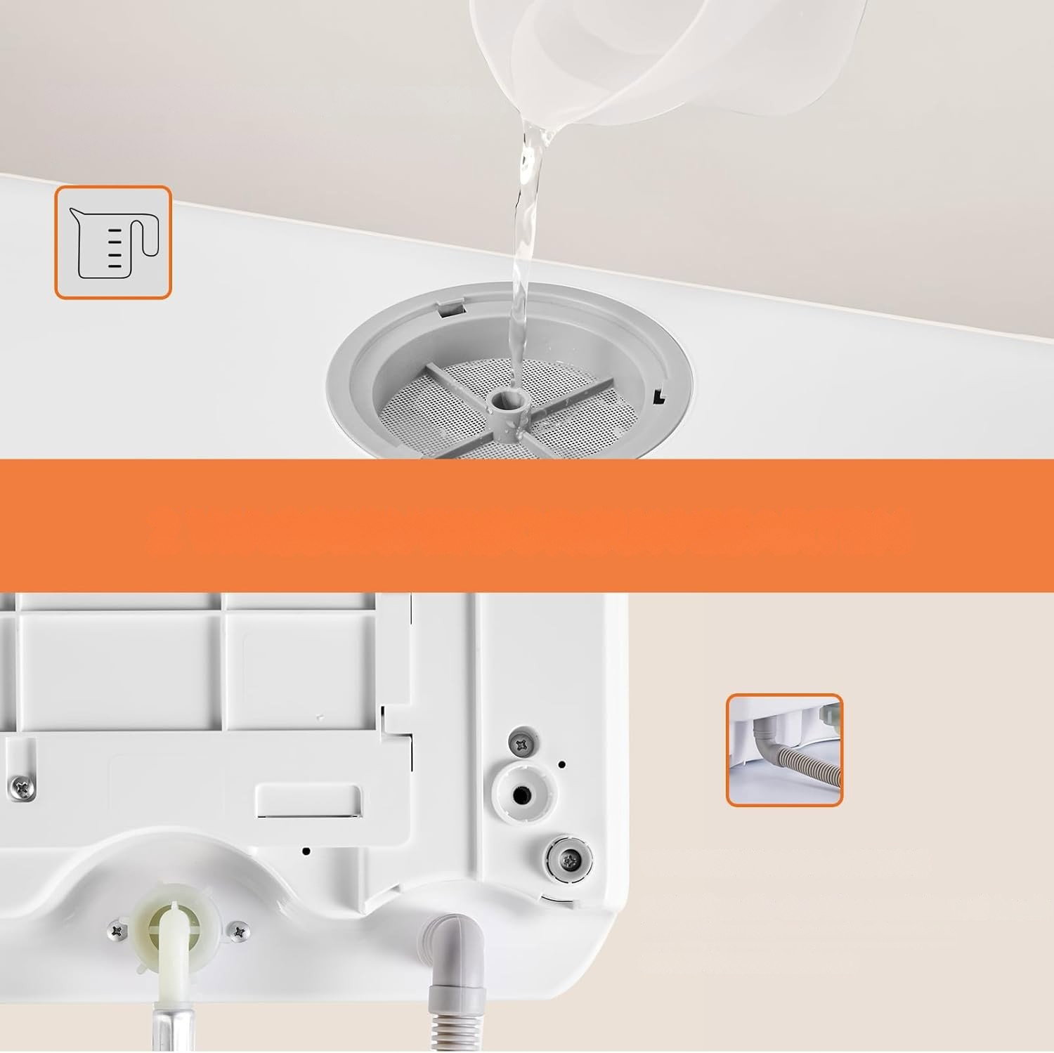 - Podwójny system zasilania w wodę: umożliwia korzystanie zarówno z podłączenia do kranu, jak i z wbudowanego zbiornika. Zintegrowany zbiornik o pojemności 5 litrów pozwala na ręczne napełnianie, co umożliwia ustawienie urządzenia w dowolnym miejscu, bez konieczności stałego podłączenia do instalacji wodnej. Wbudowany wskaźnik poziomu wody sygnalizuje osiągnięcie odpowiedniego poziomu napełnienia.