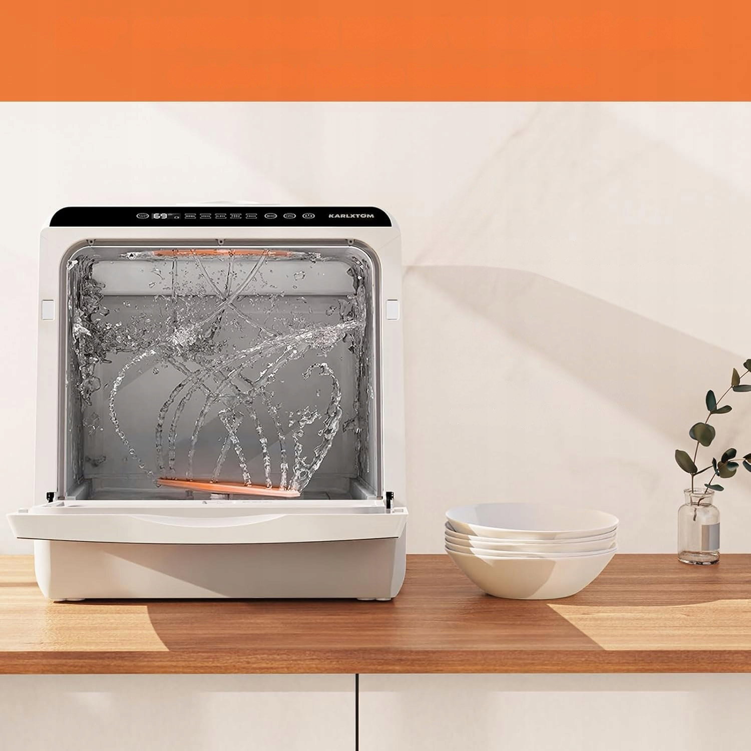 Niewielka zmywarka stołowa została zaprojektowana z myślą o małych kuchniach, gdzie liczy się oszczędność miejsca, wody i czasu.