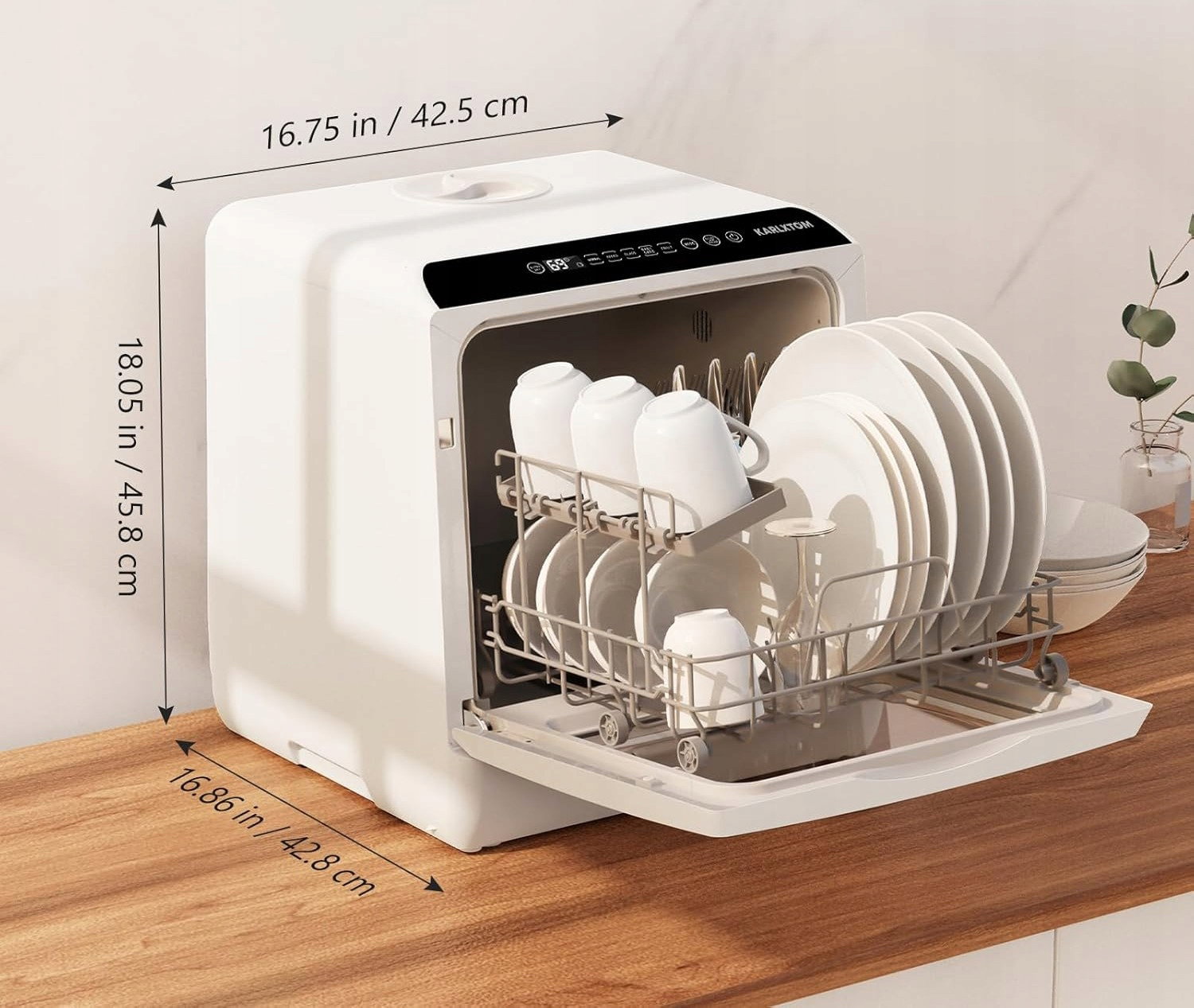 - Kompaktowa konstrukcja: niewielkie wymiary pozwalają na ustawienie zmywarki bezpośrednio na blacie kuchennym, nawet w bardzo ograniczonej przestrzeni. Pomimo kompaktowej obudowy urządzenie mieści do 4 pełnych zestawów naczyń, co w zupełności wystarcza dla 3–4 osób. Przemyślany układ koszy umożliwia wygodne rozmieszczenie talerzy, kubków, misek i sztućców.