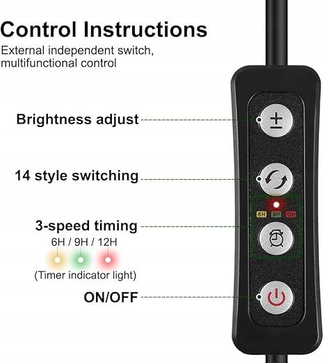 Przełącznik sterujący: Zewnętrzny, niezależny przełącznik sterujący umożliwia zwiększanie i zmniejszanie jasności, włączanie kontrolek, włączanie zasilania oraz przełączanie trybów.