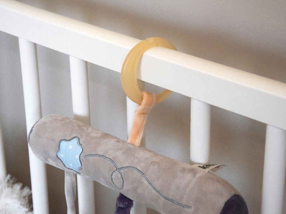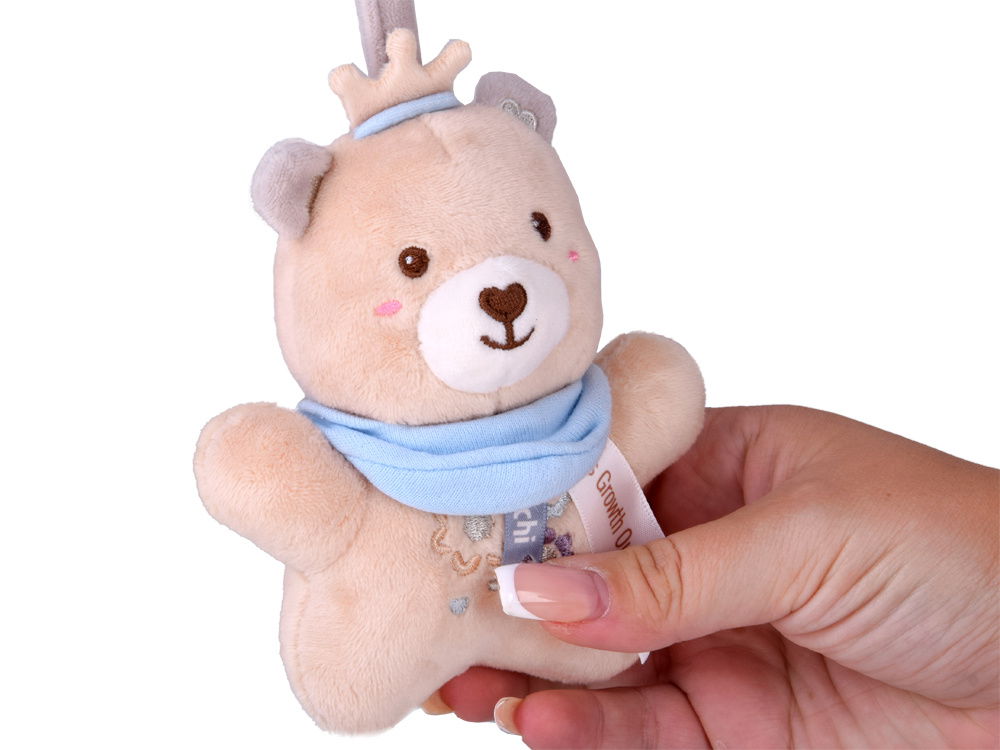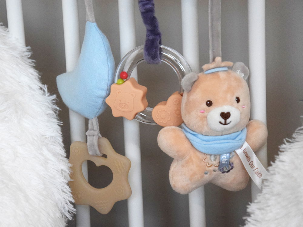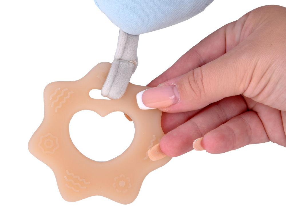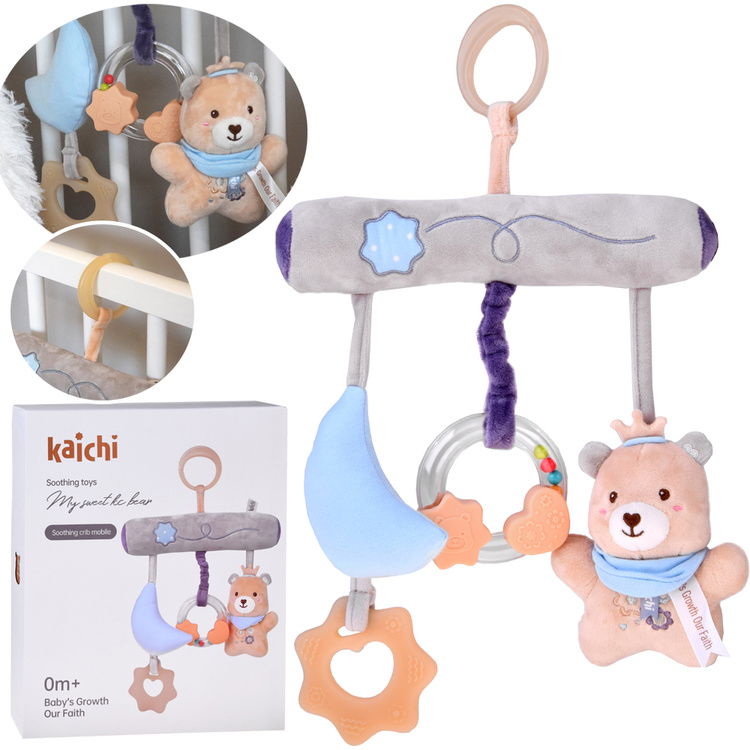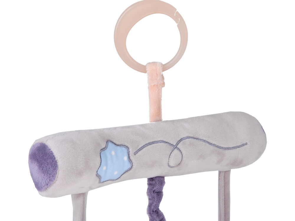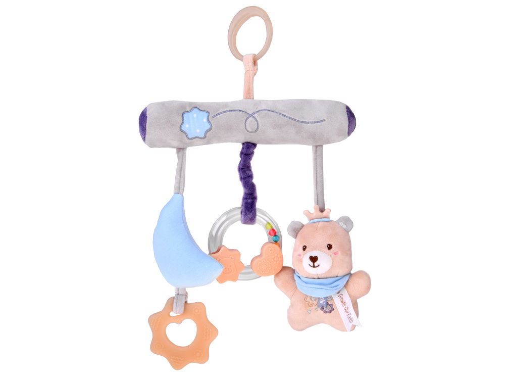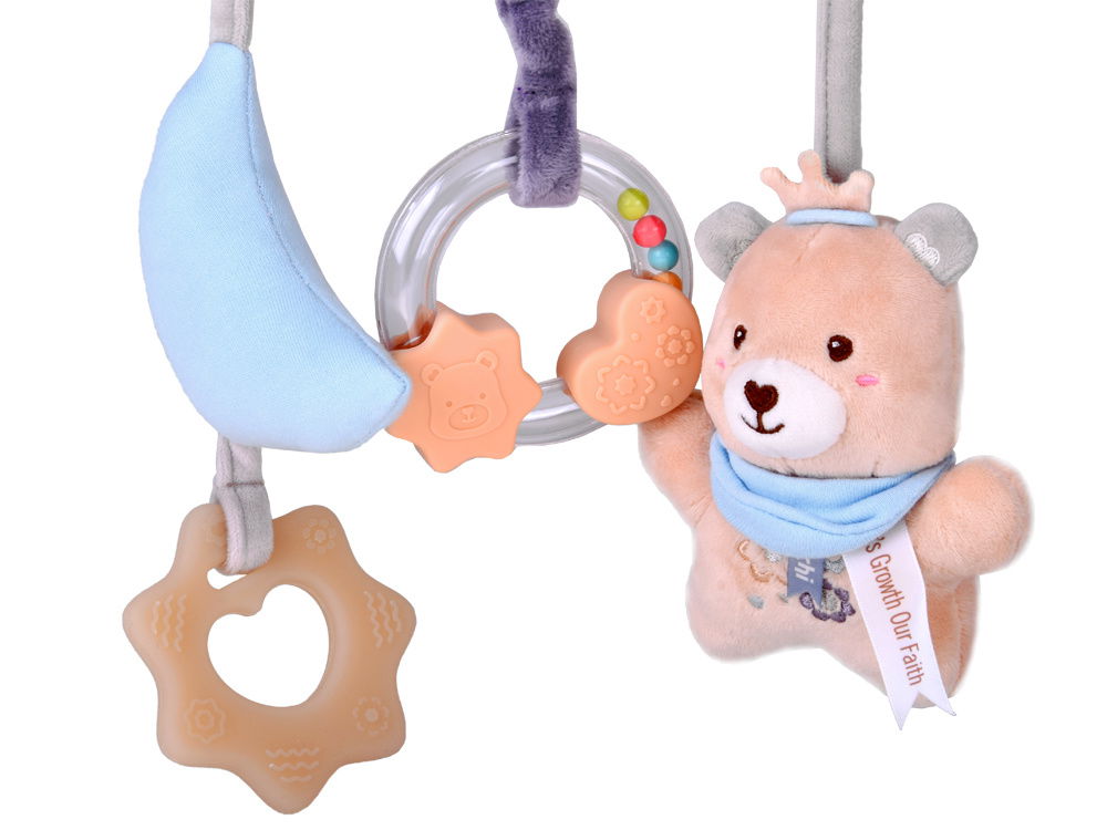 Zawieszka posiada różnorodne elementy, takie jak pluszowy miś, miękki księżyc, silikonowy gryzak gwiazdka i grzechotka z kolorowymi kuleczkami, które stymulują rozwój zmysłów dziecka. Dzięki praktycznemu uchwytowi, zabawkę można łatwo zawiesić w łóżeczku, wózku czy foteliku samochodowym.