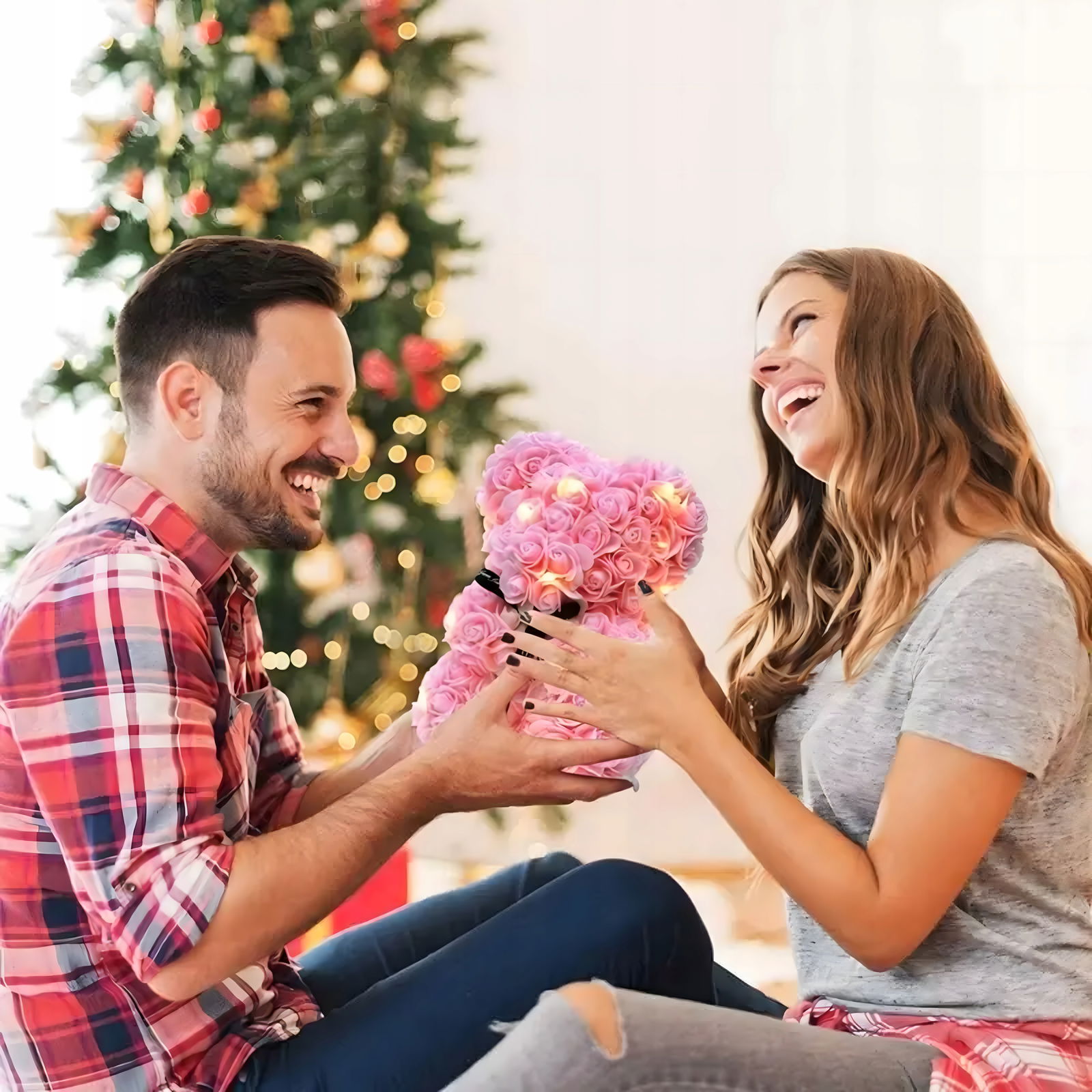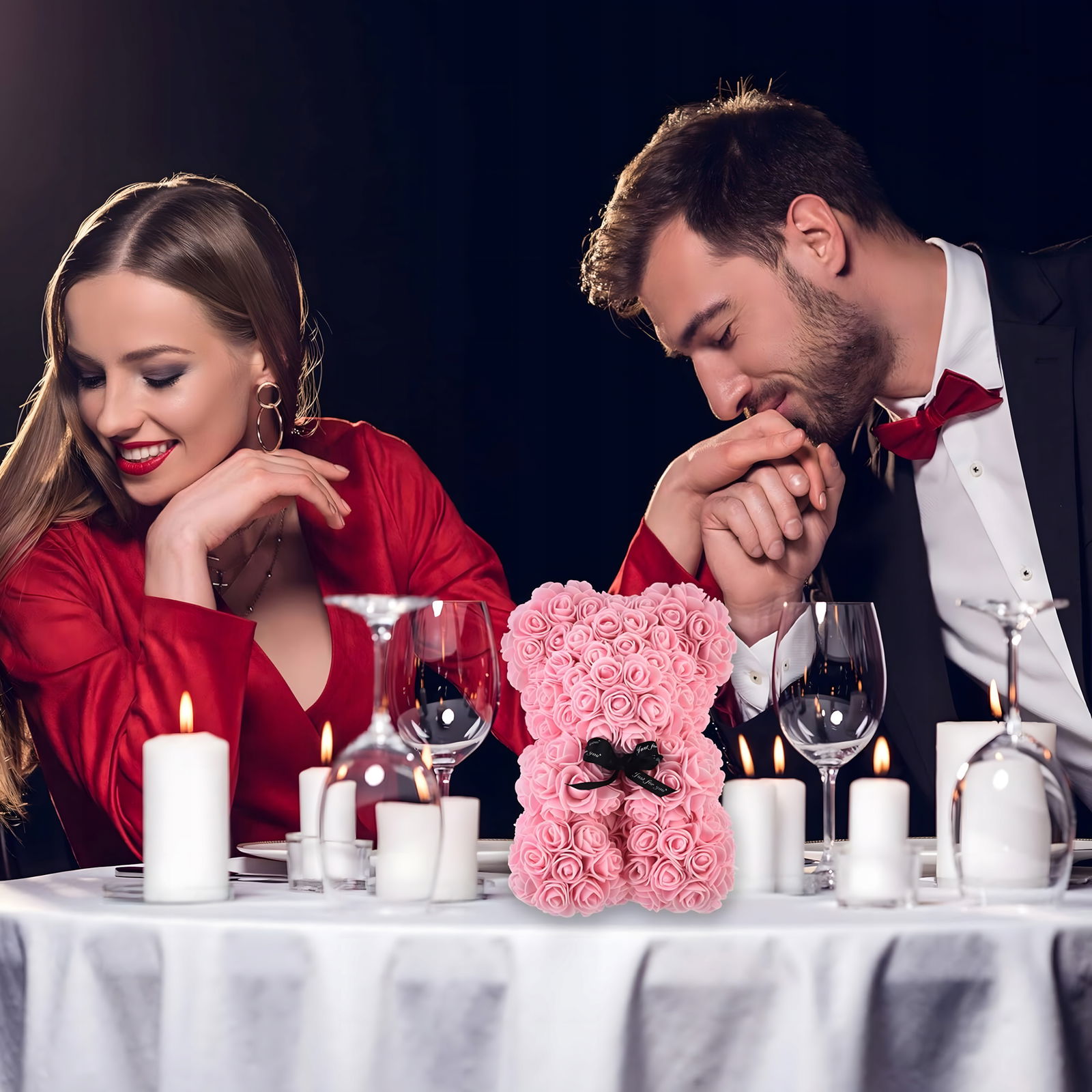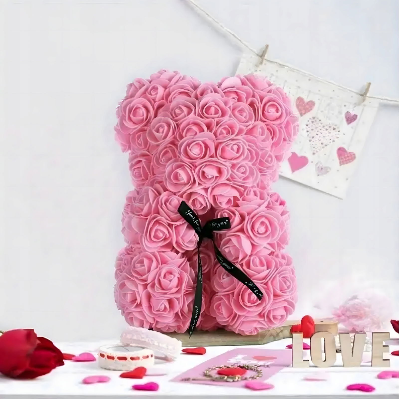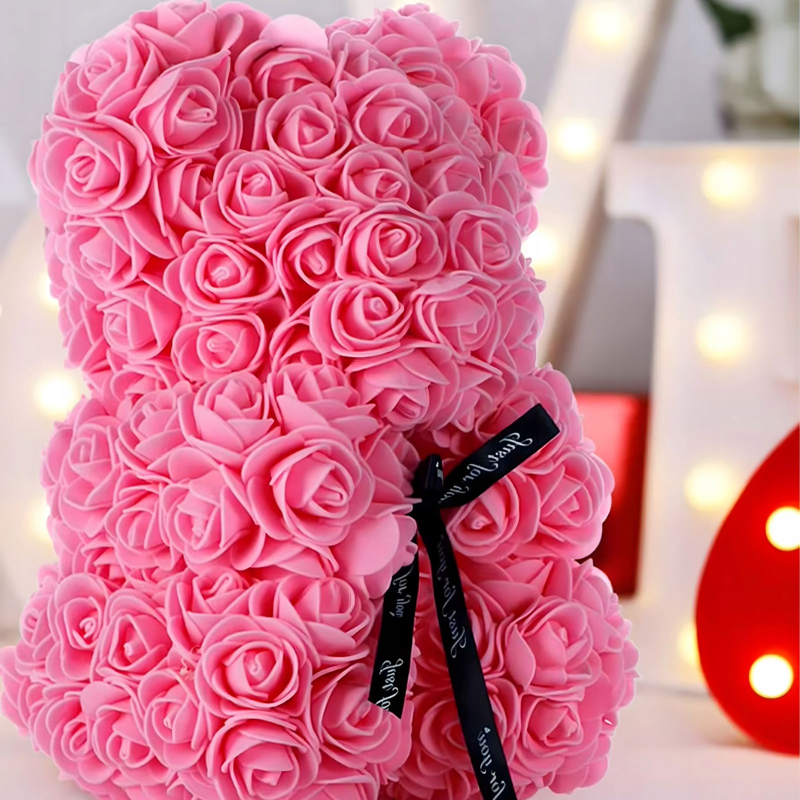 Miś z róż doskonale prezentuje się na półce, toaletce, biurku lub komodzie. Dodaje pomieszczeniu romantycznego charakteru i delikatnej elegancji, a przezroczyste pudełko ekspozycyjne sprawia, że wygląda jak luksusowy upominek premium. To świetny element dekoracyjny zarówno do nowoczesnych, jak i klasycznych aranżacji.
