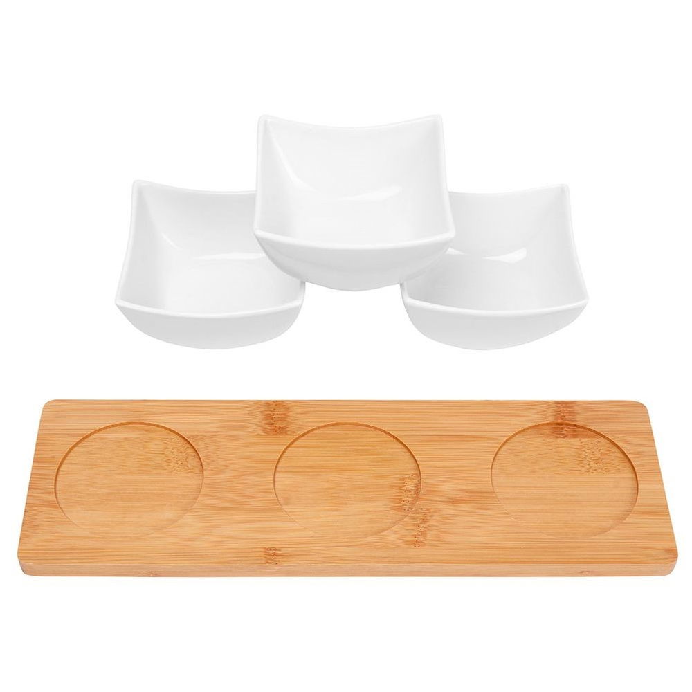 Zestaw trzech miseczek na bambusowej tacy. Wykorzystamy je do serwowania przekąsek, przystawek, sosów i dipów. Zestaw pięknie prezentuje się na stole. Serwowane sosy lub przekąski są umieszczone w jednym miejscu, dzięki czemu wygodnie je przeniesiemy. Sprawdzi się do użytku domowego oraz profesjonalnego.