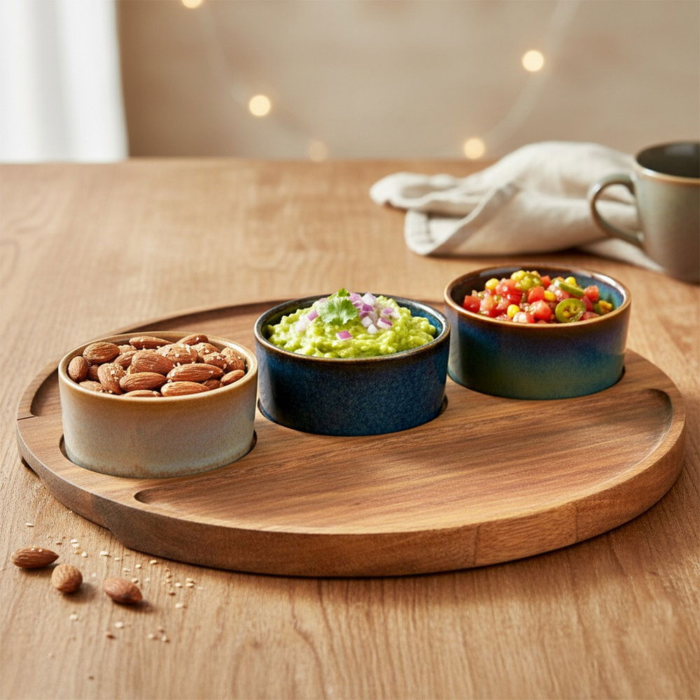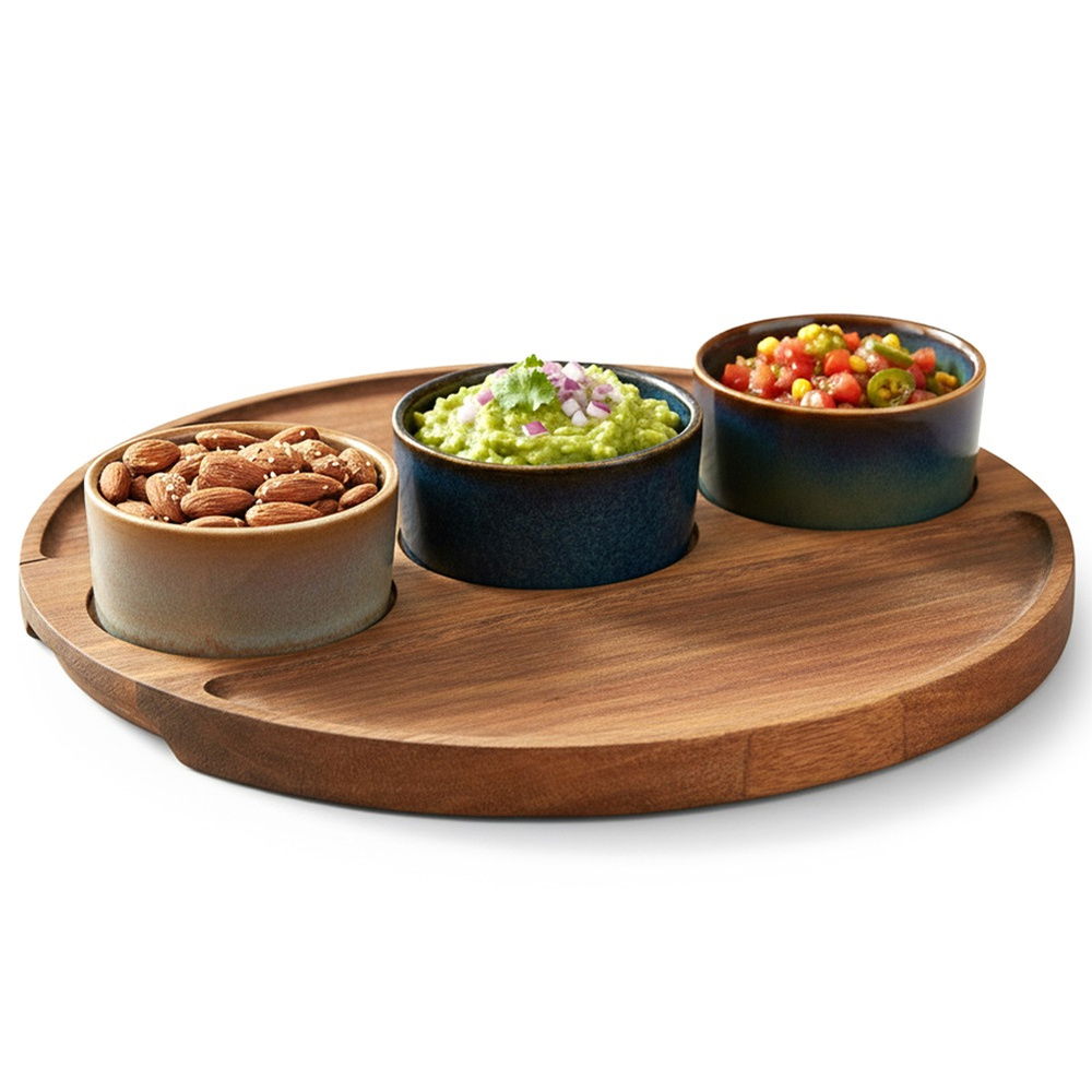 Wygodna taca do serwowania - Podstawą zestawu jest okrągła taca wykonana z pięknego drewna akacjowego. Taca posiada specjalne wgłębienia, które stabilizują miseczki i zapobiegają ich przesuwaniu. Miseczki bez tacy nadają się do mycia w zmywarce do naczyń.