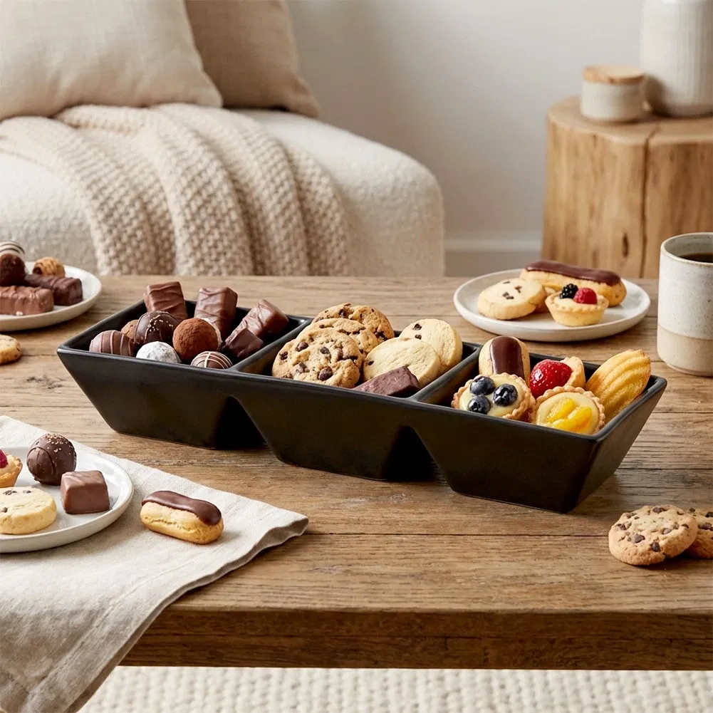 Potrójna dla wygody serwowania - Trzy niezależne części pozwalają na oddzielne podawanie przekąsek, takich jak orzeszki, oliwki, suszone owoce czy dipy, bez ryzyka ich połączenia.