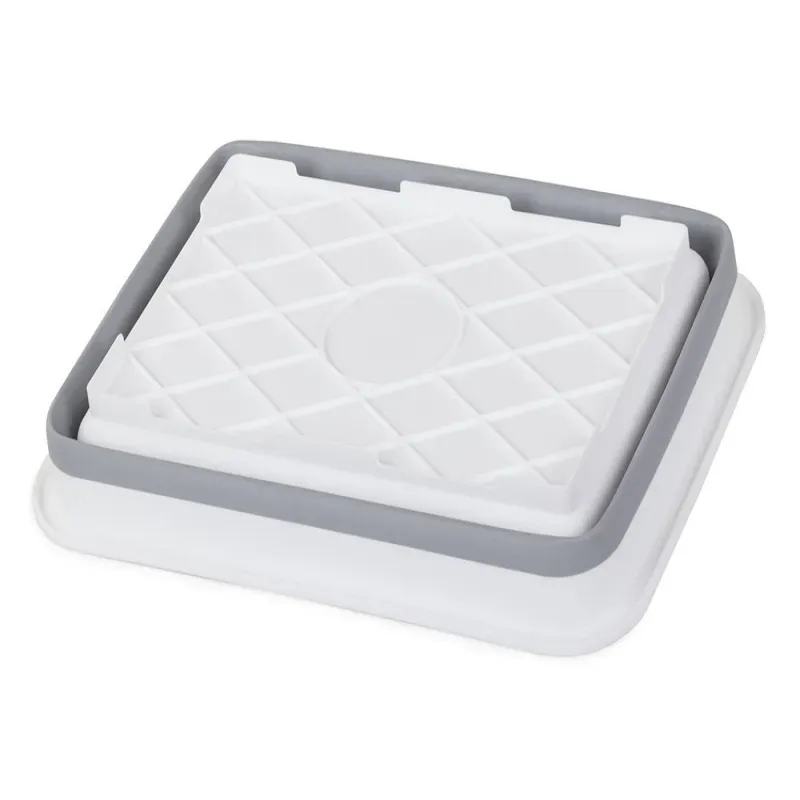 Pojemnik po złożeniu może pełnić funkcję deski do krojenia. Jest stabilna i nie przewraca się.