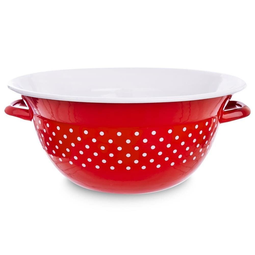 Emaliowana miska kuchenna z uchwytami, utrzymana w stylu retro. Wykonana z solidnych materiałów. Zapewnia komfortowe mieszanie, wyrabianie ciasta oraz przygotowywanie różnorodnych potraw. Można w niej serwować potrawy, przekąski czy sałatki bezpośrednio na stole. Wyjątkowy design sprawi, że miska będzie stanowiła niezwykłą ozdobę kuchni. Chcąc wyeksponować ją w jadalni lub kuchni, możemy przechowywać w niej owoce. Naczynia emaliowane mogą posiadać niedoskonałości produkcyjne, które są naturalne dla tego typu naczyń: wybrzuszenia, niesymetryczne nadruki itp. Nie wpływają one na jakość produktu i przygotowywanych potraw, a jedynie podkreślają ich metodę tradycyjnego wykonania.