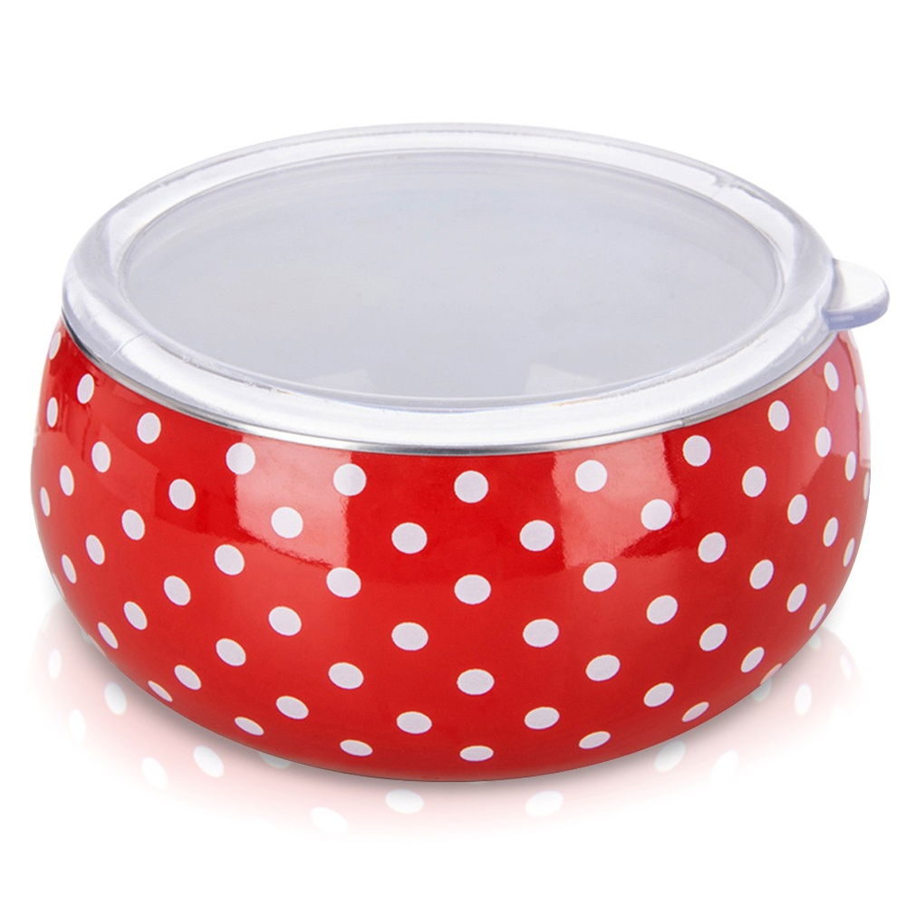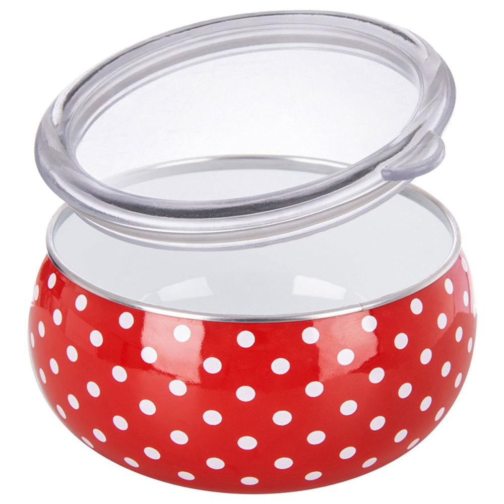Wykonana ze stali emaliowanej - Wykonana z najwyższej jakości stali emaliowanej w czerwonym kolorze. Posiada efektowane zdobienie w postaci białych grochów na powierzchni. Wnętrze miski jest w kolorze białym. Rant miski został wykonany ze stali nierdzewnej w srebrnym kolorze. Pokrywka wykonana z przezroczystego tworzywa. Emalia, którą pokryto naczynie jest materiałem przyjaznym dla zdrowia, a nawet bezpiecznym dla alergików.
