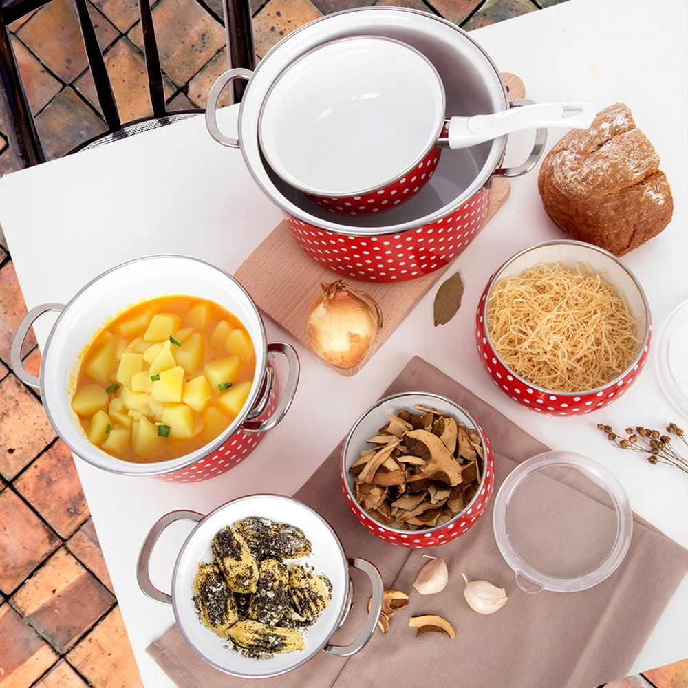 Wykonana ze stali emaliowanej - Wykonana z najwyższej jakości stali emaliowanej w czerwonym kolorze. Posiada efektowane zdobienie w postaci białych grochów na powierzchni. Wnętrze miski jest w kolorze białym. Rant miski został wykonany ze stali nierdzewnej w srebrnym kolorze. Pokrywka wykonana z przezroczystego tworzywa. Emalia, którą pokryto naczynie jest materiałem przyjaznym dla zdrowia, a nawet bezpiecznym dla alergików.