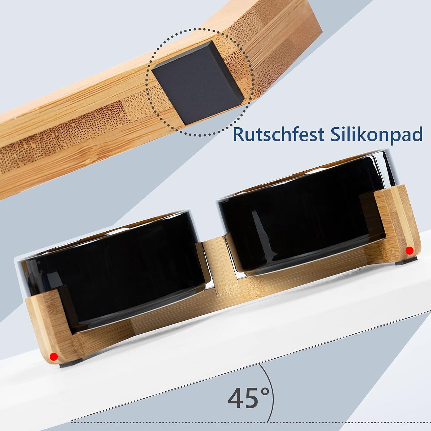 Antypoślizgowy bambusowy stojak podwyższa miskę, pomagając starszym zwierzętom w komfortowym jedzeniu. Suchy i czysty podłoga to dodatkowy atut tego rozwiązania.