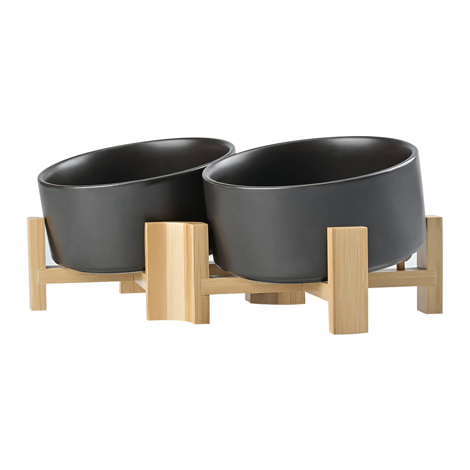 Miski dla zwierząt ceramiczne na podwyższeniu bambusowym czarne 2x850 ml