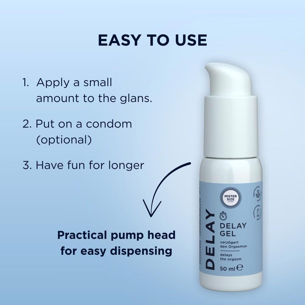 Come later – enjoy for longer! The Delay Gel from Mister Size helps men prolong their sexual pleasure without sacrificing spontaneity or sensation. The Delay Gel combines effective, natural ingredients with a skin-friendly formula. Clove oil and laureth-9 can reduce sensitivity, in order to delay orgasms. Furthermore, a slight cooling effect provides additional control, while the St. John's Wort extract and oat extract soothe the skin. The light delay gel can be applied quickly and precisely, and is easy to massage in as well. It is compatible with condoms and toys.