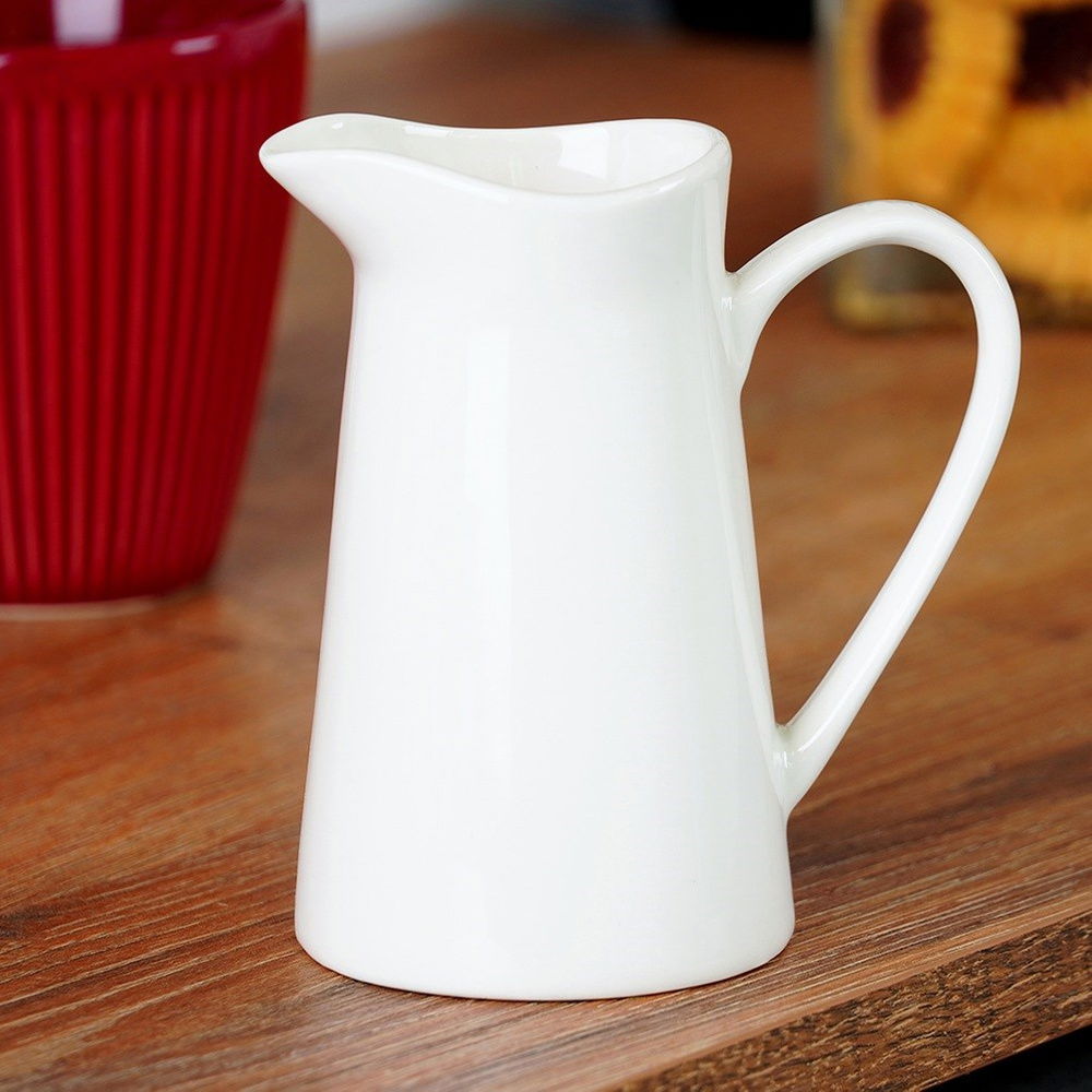 PORCELANOWY - Mlecznik z uchwytem wykonany z porcelany w kolorze białym. Przydatny podczas serwowania kawy z mlekiem lub sosu. Mlecznik ma wymiary 11 x 6,5 i pojemność 200 ml.