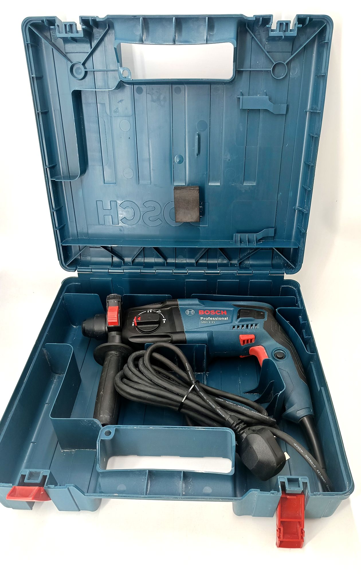 W zestawie znajduje się młot udarowy Bosch GBH 2-21 oraz walizka transportowa.