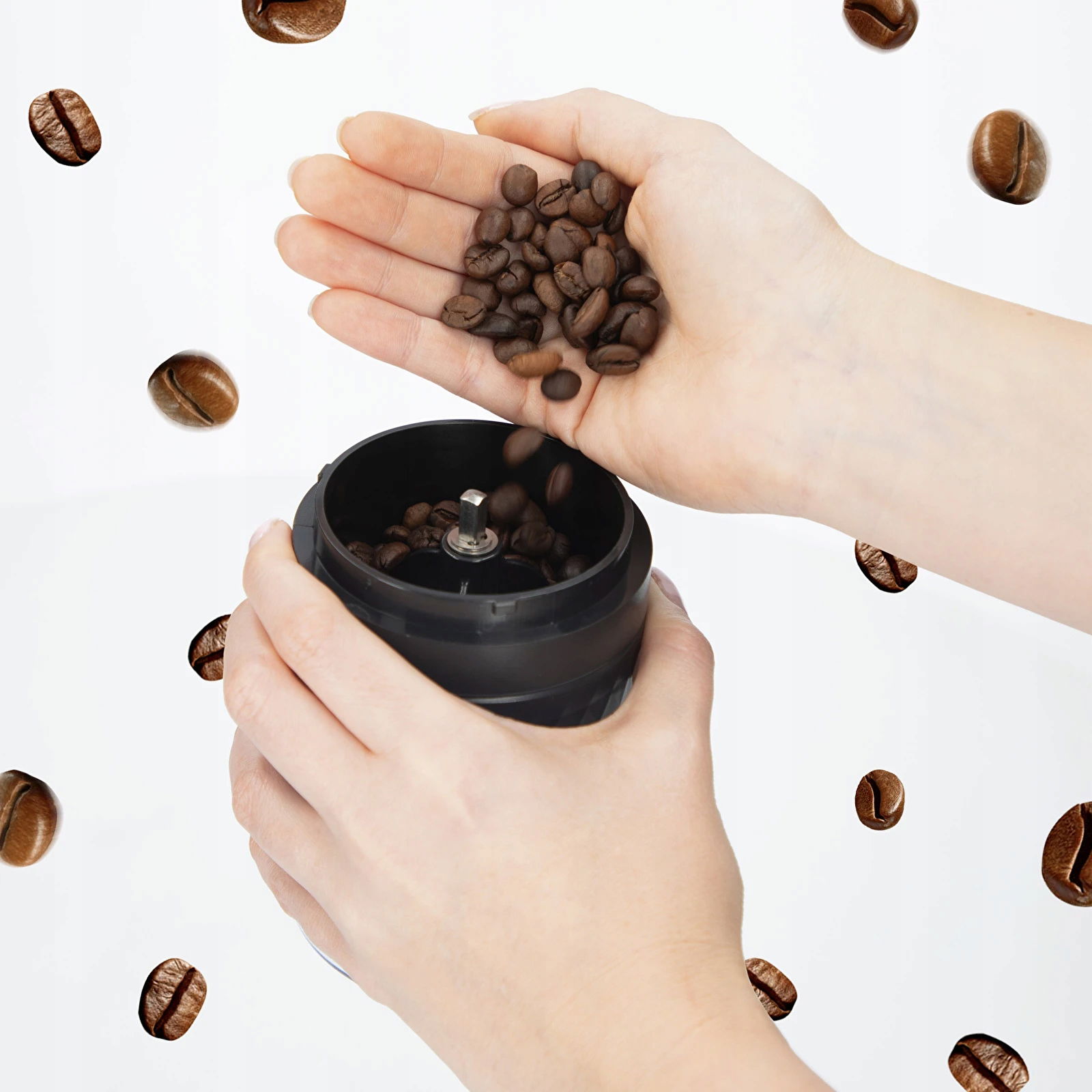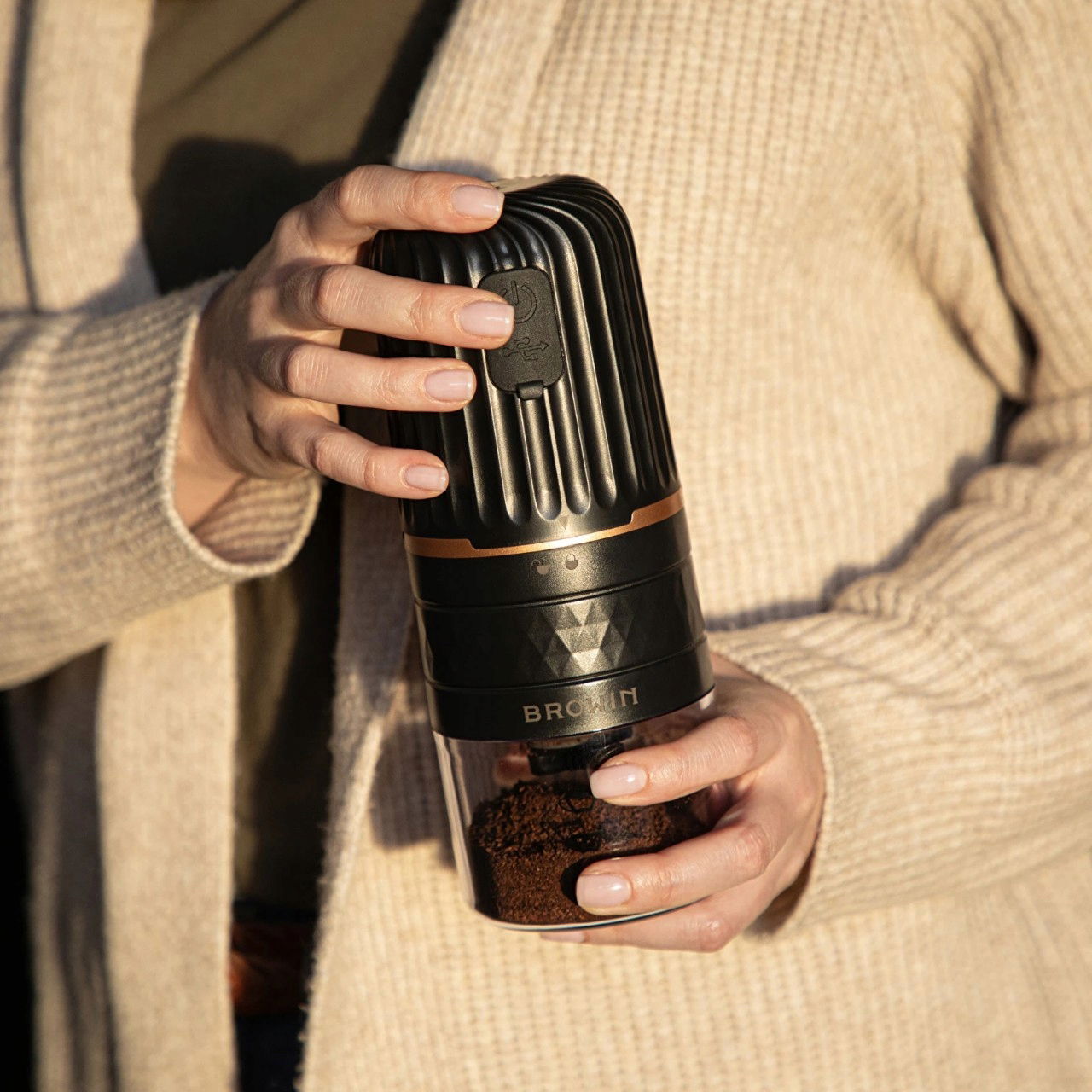 Opcja ładowania poprzez złącze USB - wystarczy podłączyć przewód do gniazda USB-C u młynku i portu USB-A w laptopie czy power banku. Wybierając ładowanie tradycyjne, należy użyć typowej ładowarki sieciowej. Idealna pojemność - wsad kawy ziarnistej: do 41 g, pojemność pojemnika na kawę zmieloną: 60 g. Dozowanie zmielonej kawy ułatwia czytelna infografika zamieszczona na pojemniku, z zaznaczeniem ilości na 1-5 filiżanek espresso. Jakość i precyzja w pięknym kształcie - solidna obudowa z wytrzymałego, a przy tym lekkiego tworzywa, wysokiej jakości ceramiczne żarna, ponadczasowa kolorystyka i oryginalny design. Odpowiednia grubość kawy po zmieleniu - pokrętło umieszczone pod żarnami zapewnia ich swobodną regulację, zależnie od potrzeb i upodobań związanych z wybranym sposobem parzenia. Mobilność i łatwość użycia w domu, w pracy oraz podczas wyjazdów - wystarczy wsypać ziarna do pojemnika z żarnami, nałożyć głowicę zasilającą i włączyć młynek - po chwili zmielona kawa znajdzie się w dolnym pojemniku. W zestawie specjalna szczoteczka do czyszczenia. Bezpieczna i wydajna praca młynka bez konieczności częstego ładowania baterii - zapewnia to m.in. wytrzymała bateria o dużej pojemności oraz szczelna silikonowa nakładka z przyciskiem włącznika, osłaniająca wejście USB.