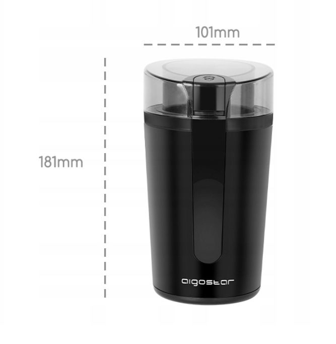 • Zawartość zestawu: młynek elektryczny Aigostar 200 W, szczoteczka z miarką, instrukcja obsługi