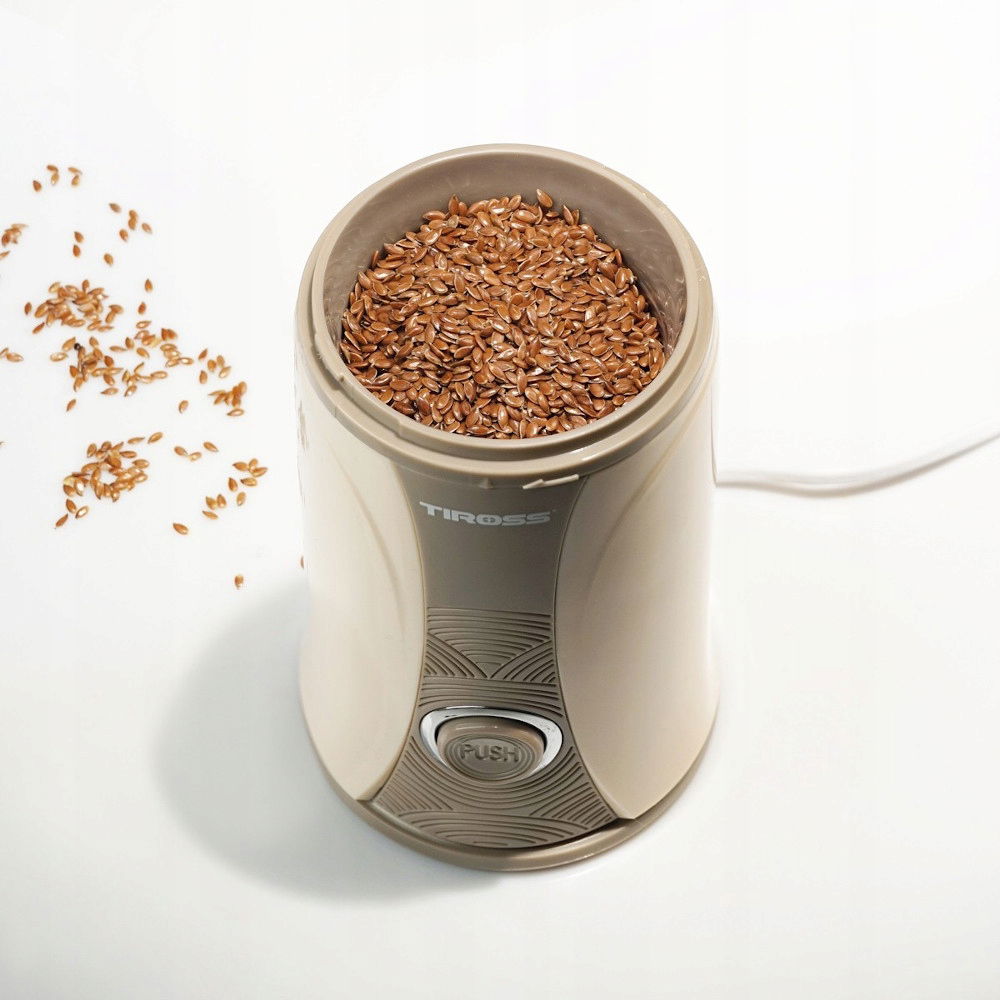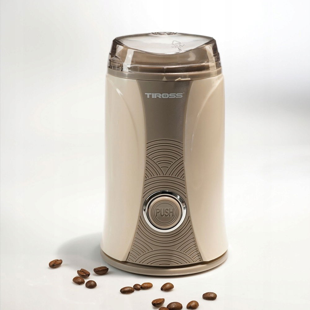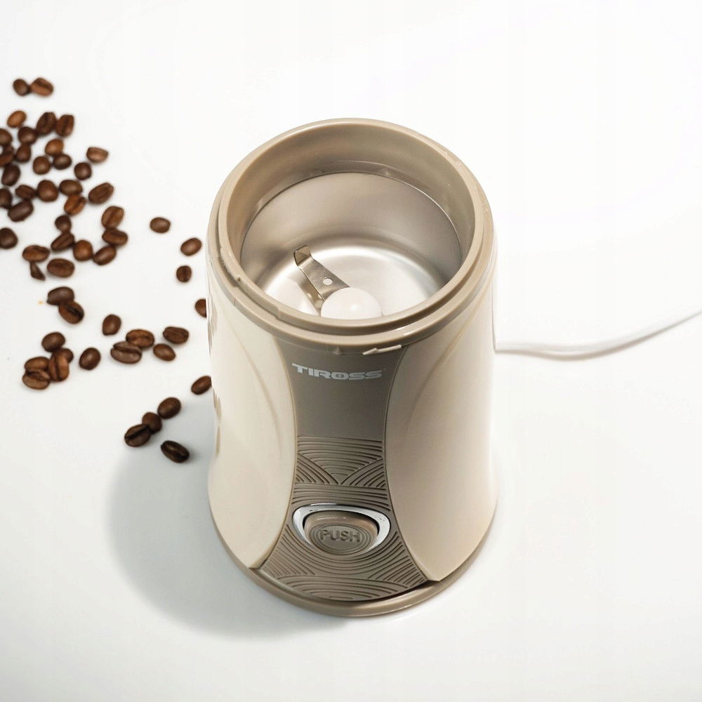Elegancki młynek do kawy z ostrzami ze stali nierdzewnej i pojemnikiem mieszczącym 50 gram ziaren zapewnia dokładne mielenie kawy dla całej rodziny.