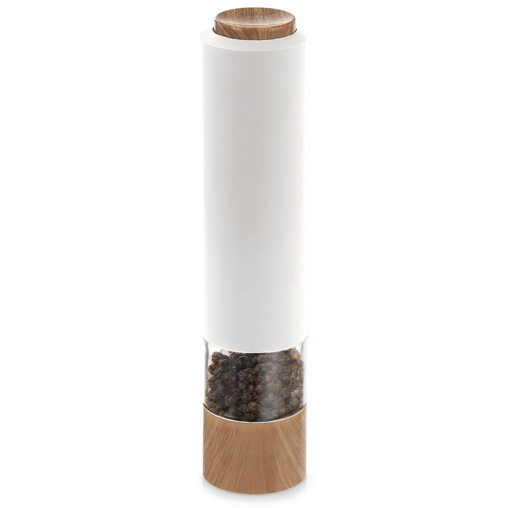 SOLIDNY - Obudowa młynka wykonana z tworzywa w kolorze białym a przycisk i dół młynka wykonane są z tworzywa wyglądem imitującego drewno. Posiada przycisk uruchamiający mielenie oraz ceramiczny mechanizm mielący. Ceramiczny mechanizm mielący gwarantuje mielenie nawet najtwardszych ziaren.