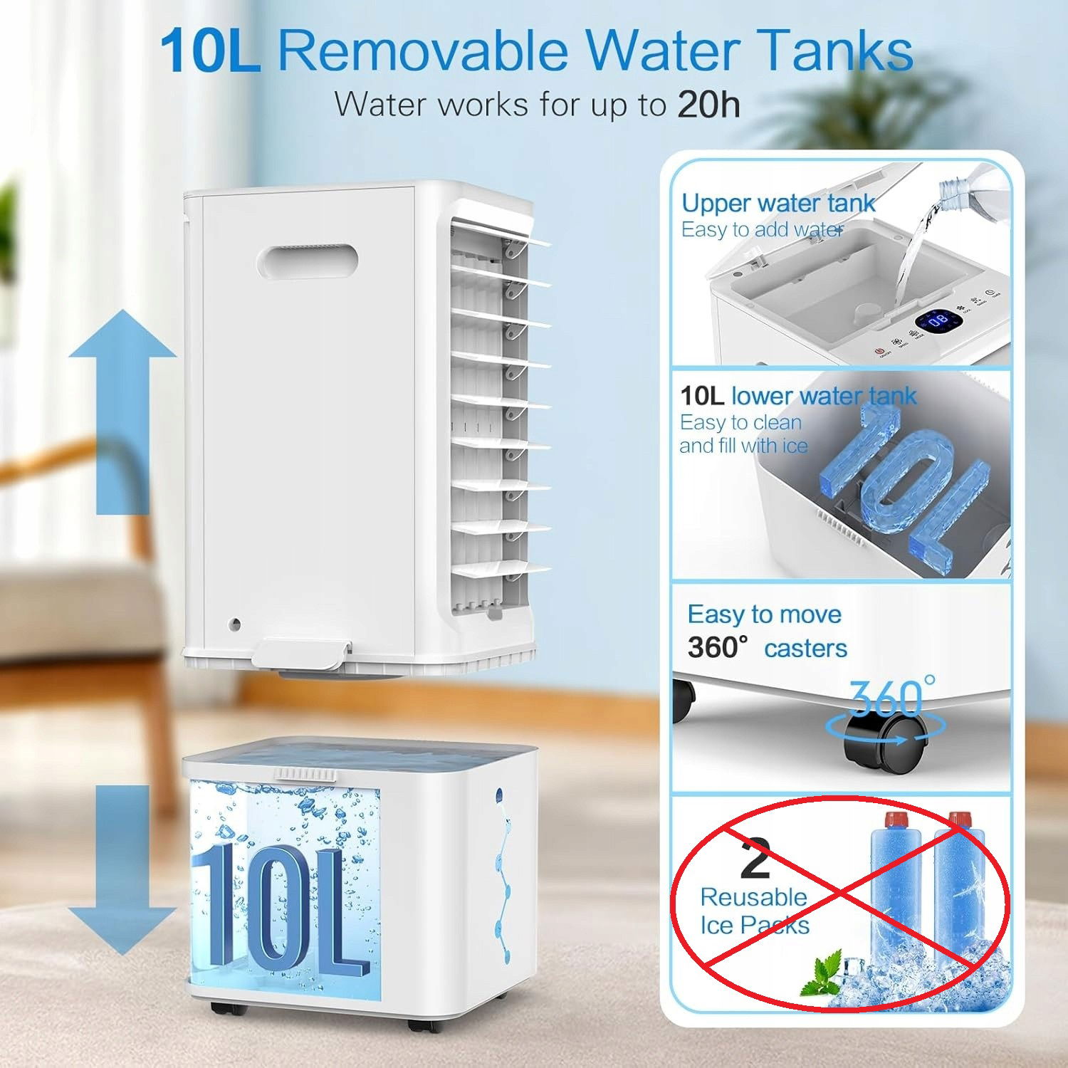 Przenośna klimatyzacja 10L, nawilżacz powietrza, wentylator, 65 W, 3 prędkości, 12-godzinny timer, oscylacja 60°, pilot zdalnego sterowania, 2 bloki chłodzące