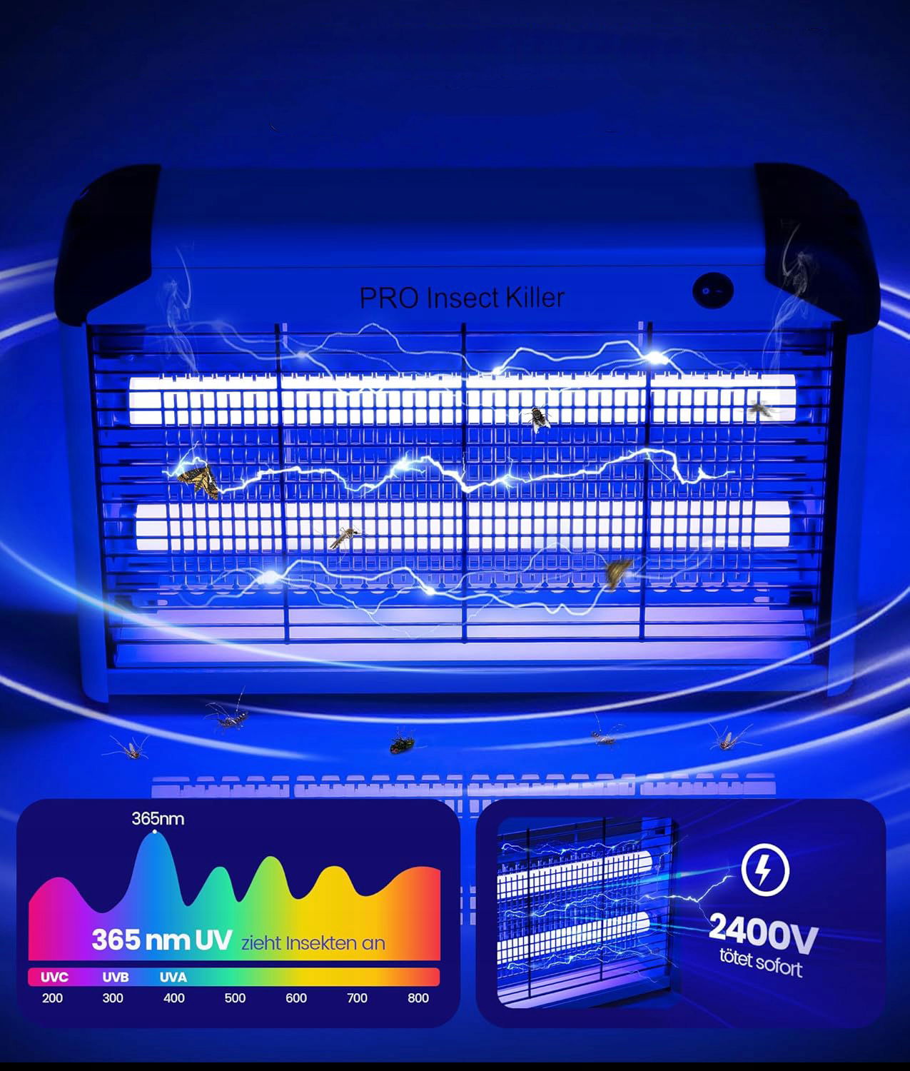 Elektryczna lampa owadobójcza o mocy 20 W wykorzystuje światło UV o długości fali 365 nm, które skutecznie przyciąga muchy, komary i inne latające owady. Po kontakcie z siatką pod napięciem 2400 V owady są natychmiast eliminowane, zapewniając szybki efekt czystego, wolnego od insektów pomieszczenia.
