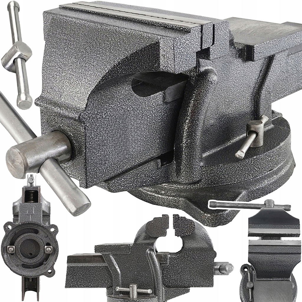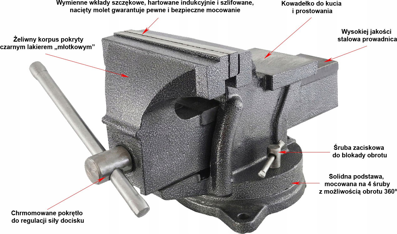 Podstawa obrotowa w zakresie 360°, pozwala na zmianę kąta położenia w płaszczyźnie poziomej. Imadło połączone z kowadłem tworzy solidną zwartą konstrukcje.