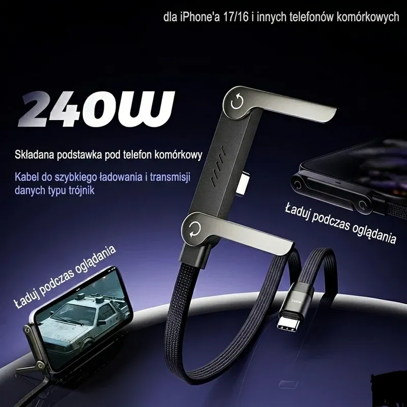 Poznaj innowacyjny kabel 2-w-1, który łączy w sobie potężną moc 240W oraz ukrytą funkcję składanej podstawki.