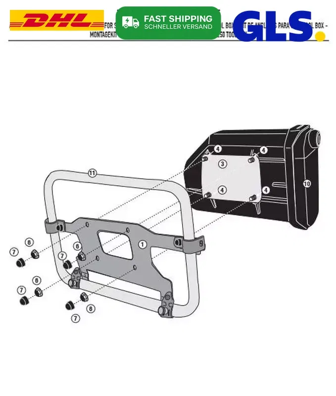 - Kompletny zestaw montażowy. może być założony na stelażach z serii KL oraz KLR (PL oraz PLR z Givi)