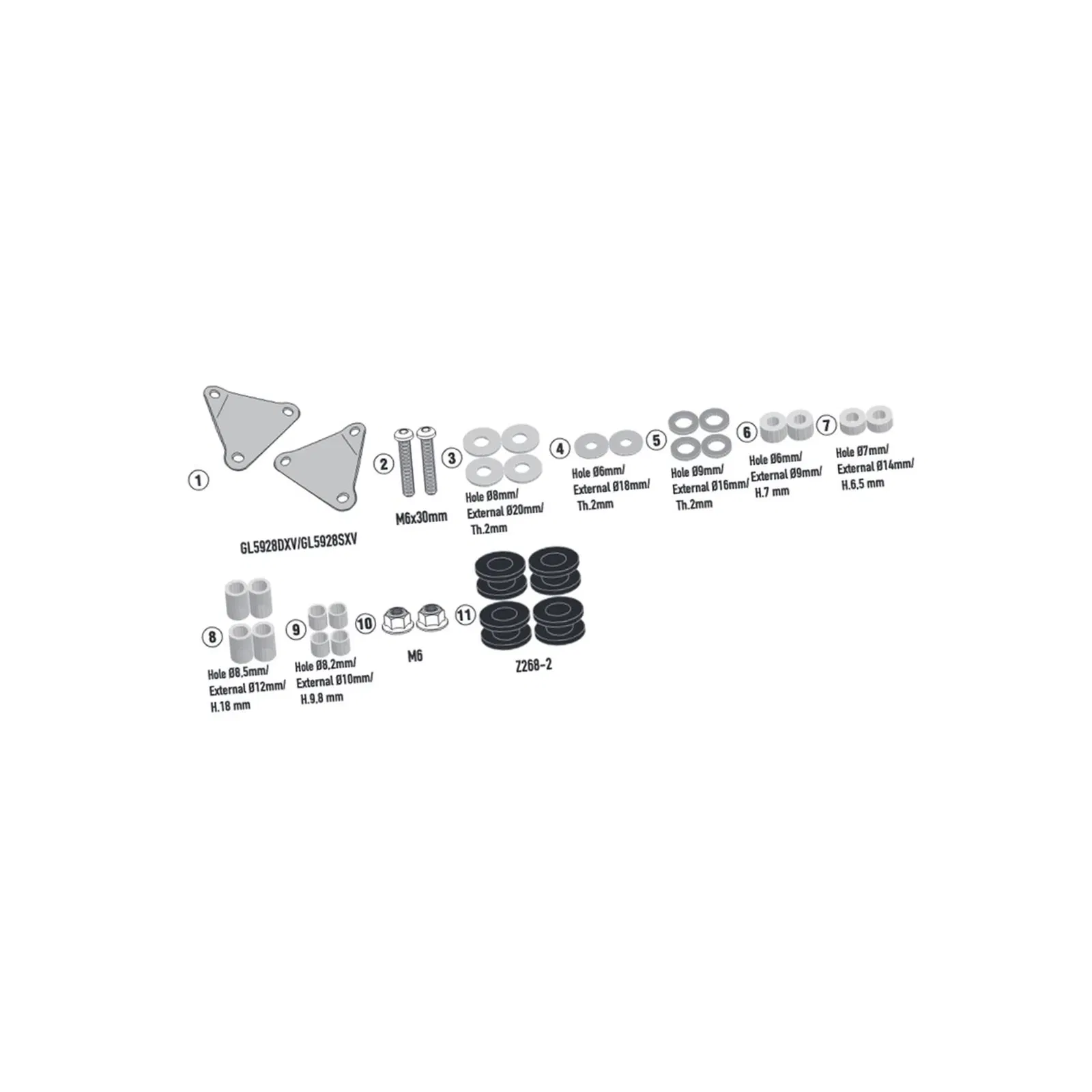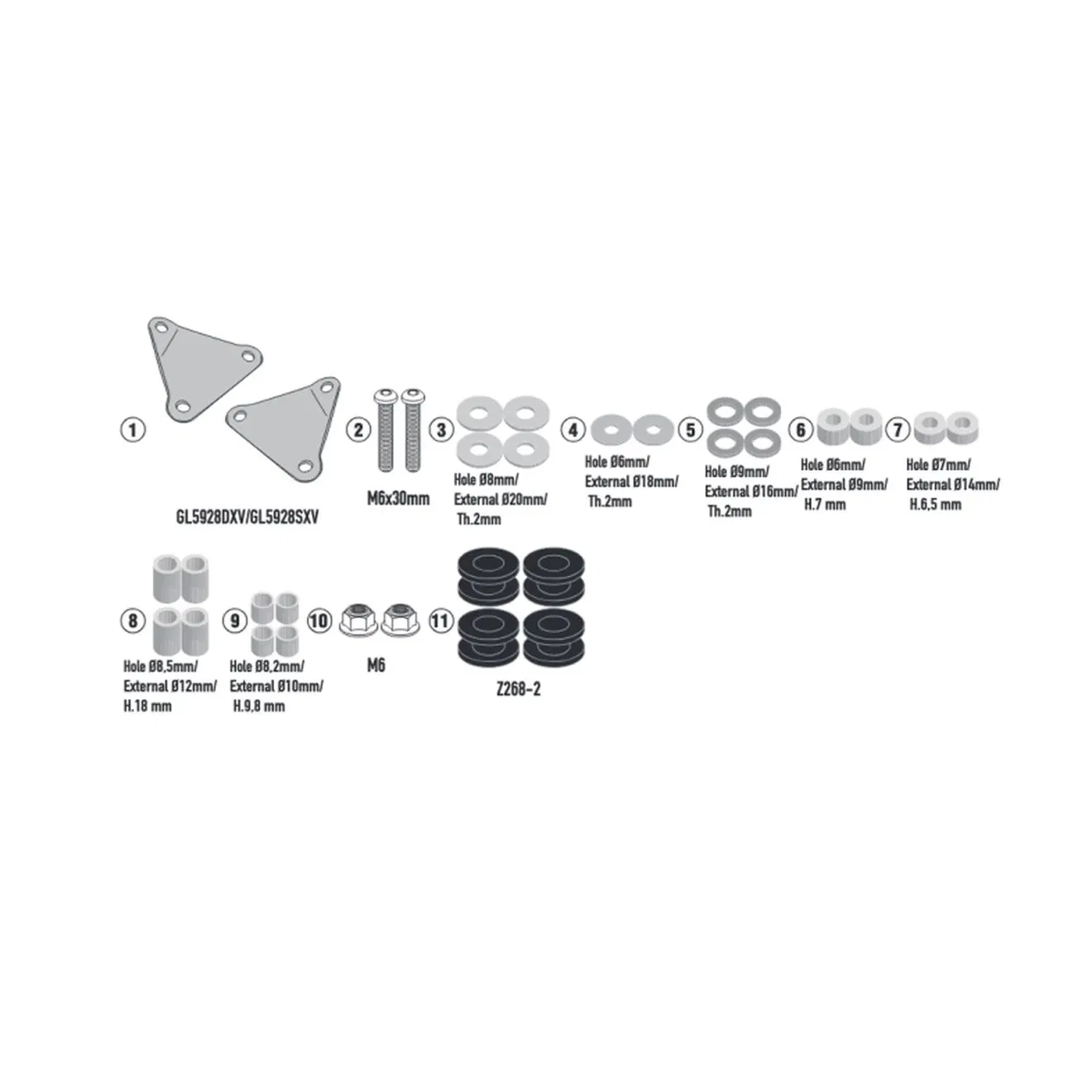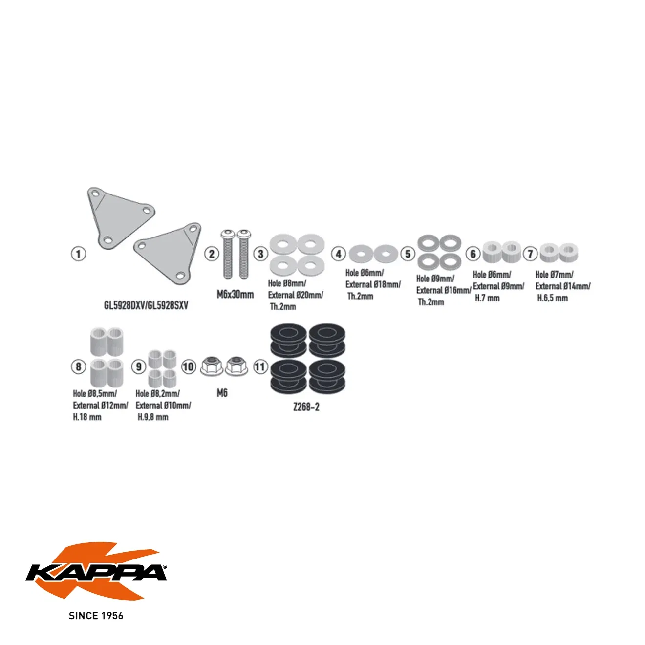 Zestaw montażowy KAPPA D6126KITK to dedykowany komplet elementów służących do instalacji szyby KAPPA D6126DTK. Zapewnia bezpieczne i stabilne mocowanie szyby na skuterze, gwarantując precyzyjne dopasowanie do fabrycznych punktów montażowych.
