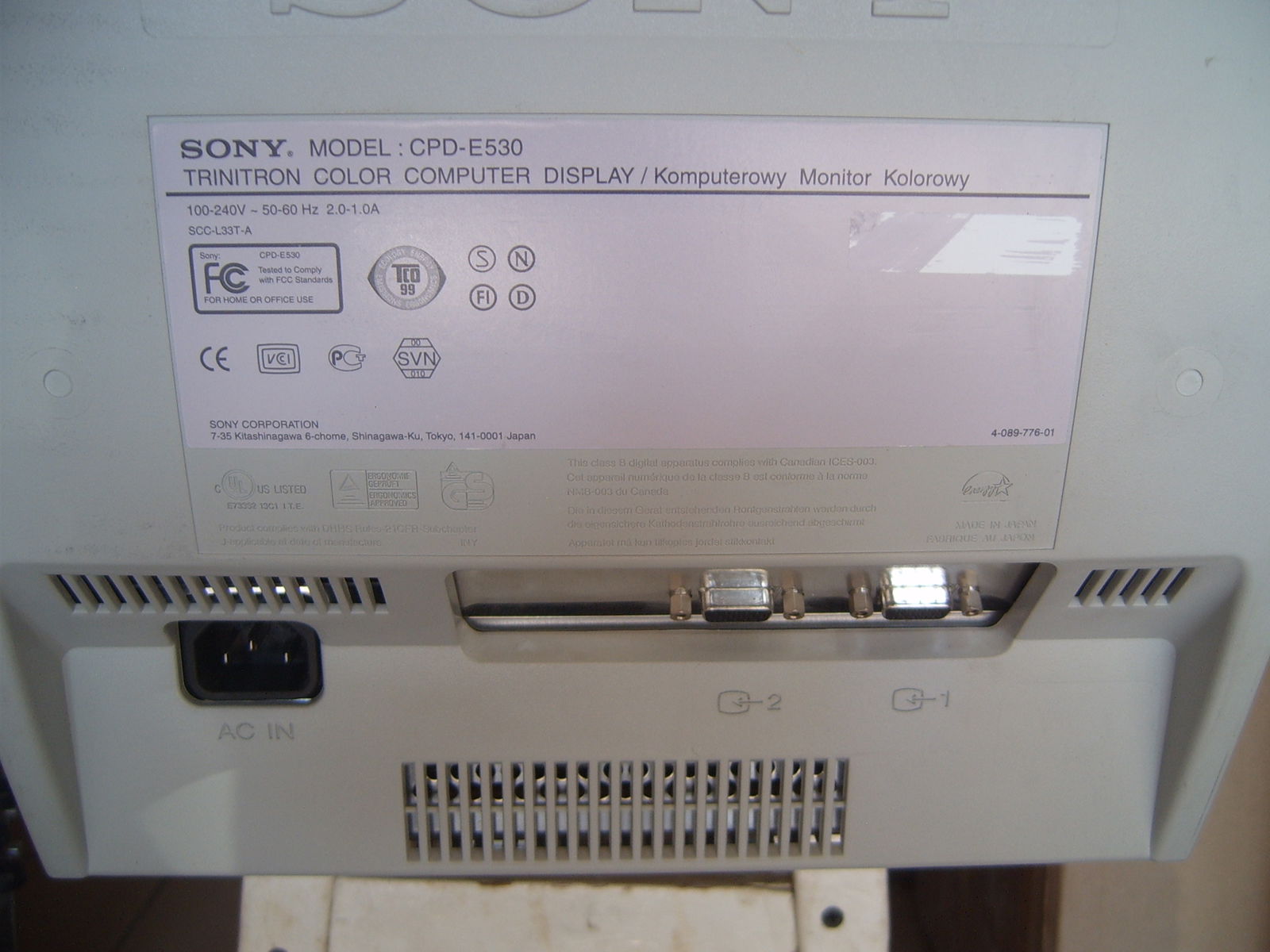 Profesjonalny kineskopowy monitor dla grafikow / fotografow CPD-E530. Niesprawny, Po wlaczneiu lampka swieci, ale nawet nie probuje zalaczac kineskopu, nie wyswietla sie nawet OSD "no signal". Po mojemu nie przechodzi autodiagnostyki, byc moze gdzies mozna sie poldaczyc zeby odczytac kod bledu, albo np spalil sie jakis bezpiecznik ( w takich porzadnych monitorach potrafi byc ich kilka) i brak ktoregos napiecia. Bede mial chwile to moze zajrze glebiej.