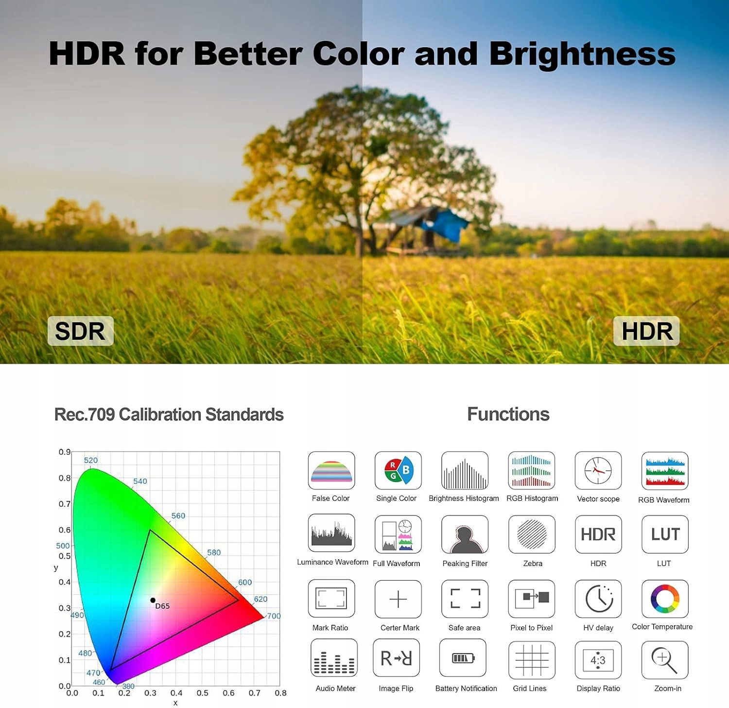 - 【3D LUT i HDR】Obsługa interfejsu USB umożliwia ładowanie 64 niestandardowych LUT, aby wyświetlić podgląd filmowania podczas fotografowania w terenie. Funkcja HDR składa się z trybu HLG i trybu PQ, może pomóc zdjęciom i filmom uchwycić szerszą gamę kolorów i pełny zakres dynamiczny.