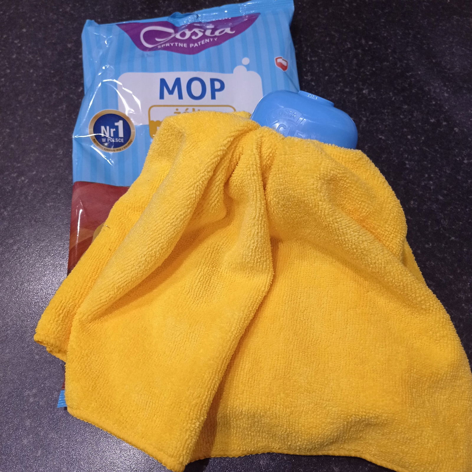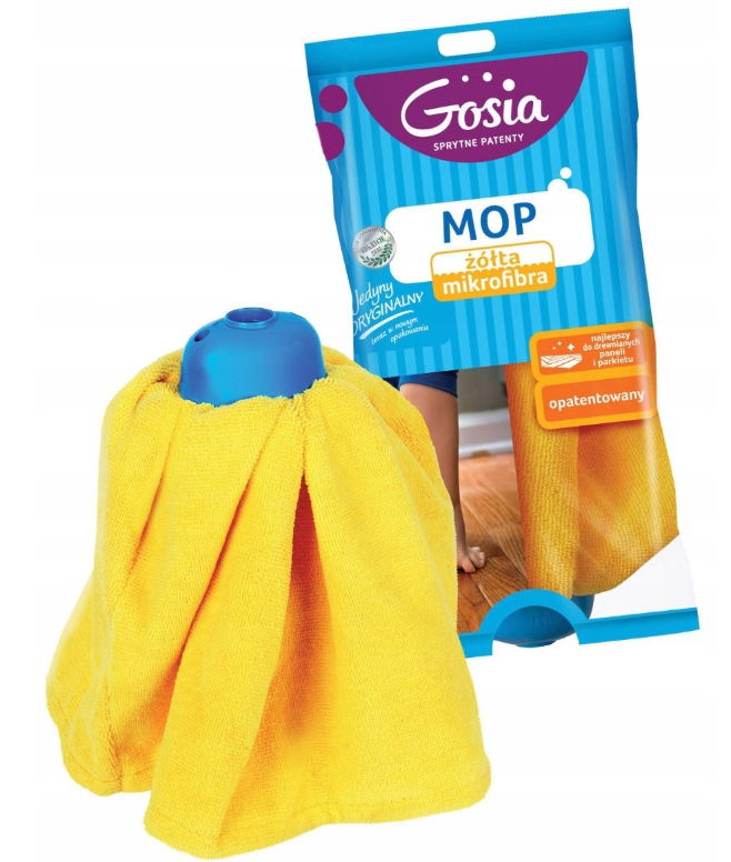 Żółty mop Gosia sukienka - ulubione przez naszych klientów narzędzie pracy. Jeśli chcesz posprzątać szybko nawet duże powierzchnie, ten mop jest dla Ciebie. Mop bez problemu można wypłukać z zebranych zanieczyszczeń i kontynuować sprzątanie. Microfibrowe, aktywne włókna przyciągają brud jak magnes i łatwo się wypłukują. Mikrofibrowa ściereczka owinięta na kształt " sukienki " wokół gąbki zapewnia dużą skuteczność sprzątania. Microfibra ma świetne właściwości chłonne. Czyszczona powierzchnia nie jest nadmiernie wilgotna { bardzo istotne np. przy panelach }. Mop nie pozostawia strzępów. Ma uniwersalną końcówkę z gwintem.