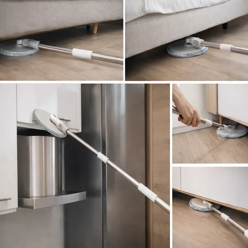 Dzięki głowicy obracającej się o 360°, mop z łatwością dociera do trudno dostępnych miejsc, takich jak kąty, przestrzenie pod meblami czy wokół narożników.