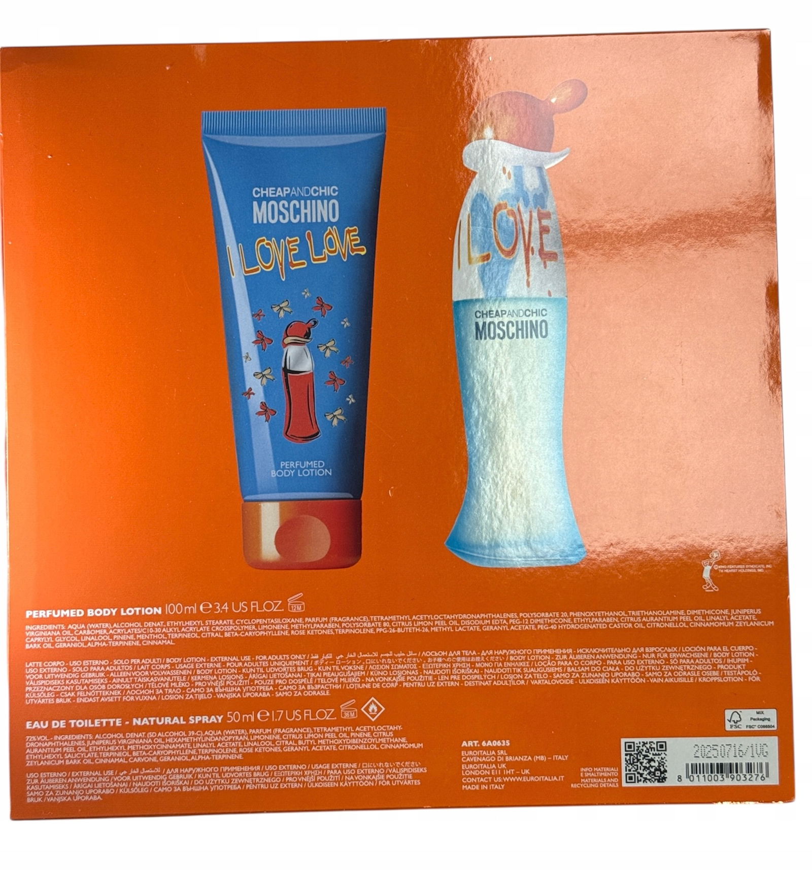 Moschino I Love Love zestaw upominkowy (EDT 50 ml + mleczko do ciała 100 ml) — grejpfrut, pomarańcza i cytryna; konwalia, róża herbaciana i liście cynamonu; piżmo, cedr i drzewo tanaka