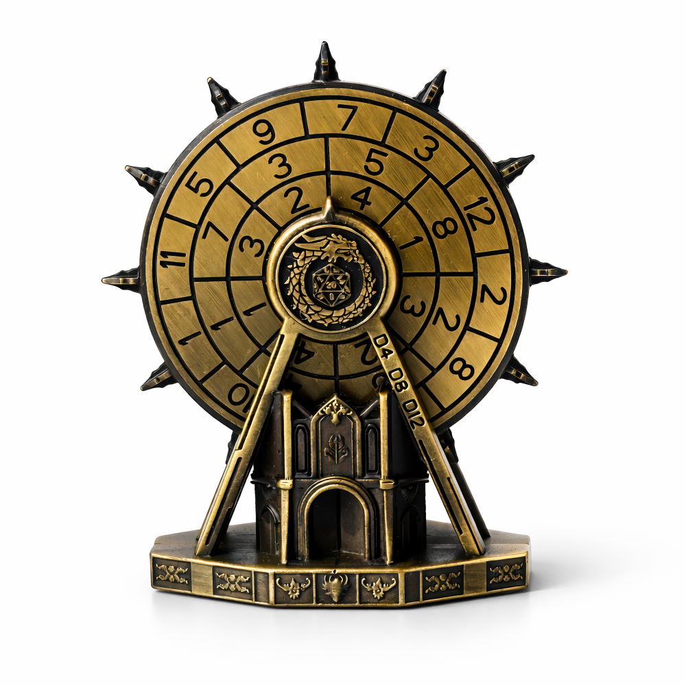 Wejdź do echem niosących się korytarzy Cathedral Dungeon i od razu zakręć losem jak pradawnym artefaktem wyjętym spod ołtarza — Brass to efektowne, 11-centymetrowe Metalowe Dice Wheel, które robi klimat na stole do RPG, na półce kolekcjonerskiej albo na biurku Mistrza Gry. Połączenie postarzanego mosiądzu z czernią wygląda jak zdobycz z lochów: głębokie żłobienia dzielą tarczę na pierścienie, a wypukłe cyfry, fazowane krawędzie i ostre podziały są czytelne na pierwszy rzut oka. Na rancie widać „kolce”, a w środku — smoczy motyw oplatający symbol kości, co daje ten fajny, gotycki vibe.