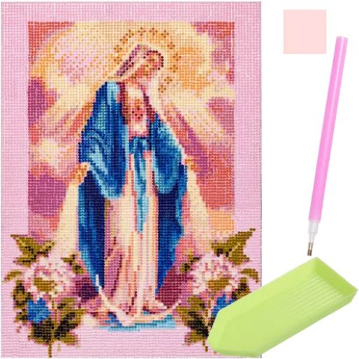SPECYFIKACJA – wzór: Maryja; wymiar płótna: 30x40 cm; wymiar obrazka: 25x35cm, płótno pokryte warstwą klejącą: tak; w zestawie: kolorowe diamenciki, aplikator, suchy klej, pojemnik; waga: 0,139 kg; waga w opakowaniu: 0,143 kg.