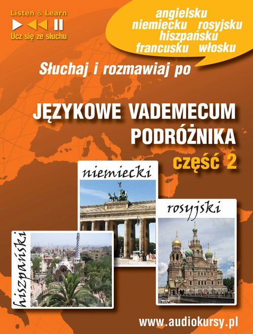 Słuchaj i rozmawiaj po angielsku, francusku, włosku, hiszpańsku, niemiecku i rosyjsku. Praktyczny kurs dla tych, którzy wyjeżdżają za granicę. Kurs uczy najbardziej przydatnych zwrotów w podróży, potrzebnych na lotnisku, w hotelu, restauracji itp. Kurs ułatwia dogadanie się i załatwienie najbardziej podstawowych spraw za granicą. Dodatkowo w książeczce PDF znajdują się praktyczne informacje dotyczące wymowy, alfabetu, form grzecznościowych czy zasad posługiwania sie językiem.