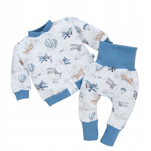 Uszyty z wysokogatunkowego, przyjemnego w dotyku materiału. Bluza z kolorowym nadrukiem samolotów i balonów. Zapinana na napki. Spodenki posiadają w pasie gumę nie uciskającą brzuszka dziecka. Zarówno bluza i spodenki zakończone są miękkimi ściągaczami.