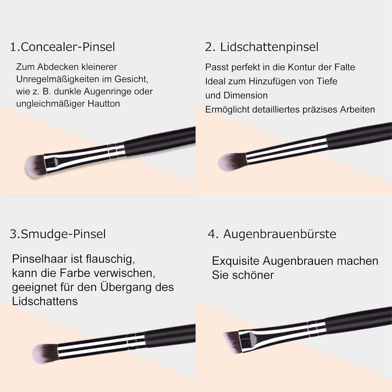 Zestaw pędzli do makijażu oczu: w zestawie pędzel do cieni do powiek, pędzel do mieszania, pędzel do brwi i pędzel do zakreślaczy. Proste 4 pędzle umożliwiają wykonywanie perfekcyjnego makijażu oczu