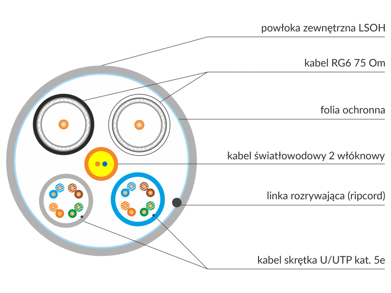 Umieszczone w jednej powłoce 2 przewody teleinformatyczne U/UTP kat.5e, 2 przewody telewizyjne RG6 oraz 1 dwuwłóknowy przewód światłowodowy FTTH 2J idealnie sprawdzają się w budownictwie wielorodzinnym, usprawniając montaż oraz oszczędzając czas instalatora.