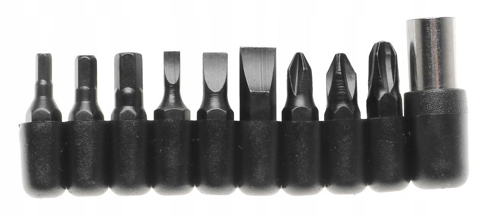 W zestawie 9 nasadek z bitami: