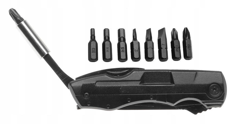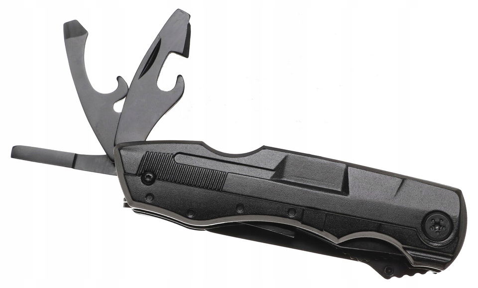 • W rękojeści znajdują się: ostrze, kombinerki z przecinakiem, otwieracz do puszek, otwieracz do butelek, uchwyt z nakładanymi końcówkami