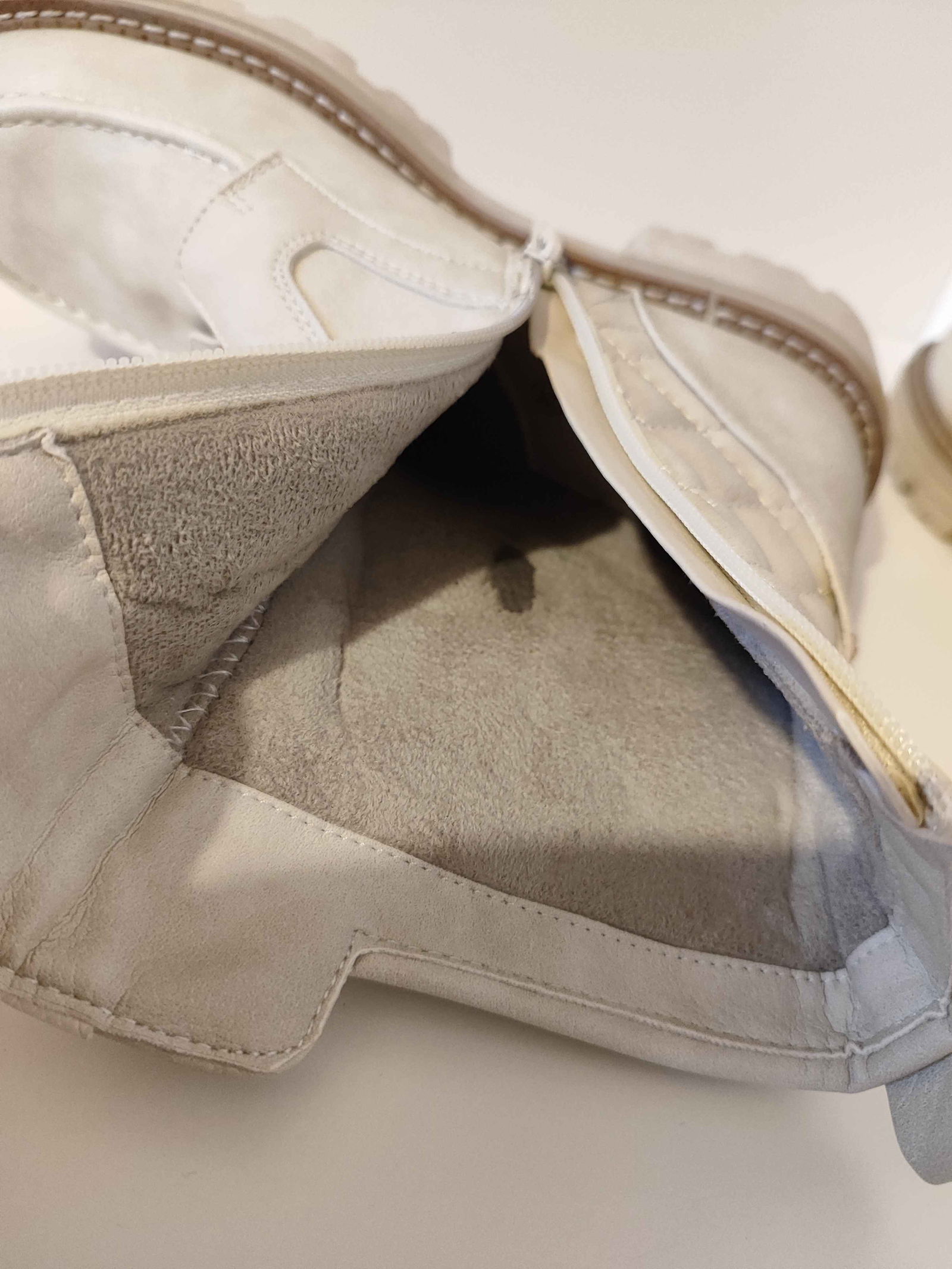 W lewym bucie widoczna plama/sklejenie materiału o wymiarach ok. 3 × 0,5 cm.