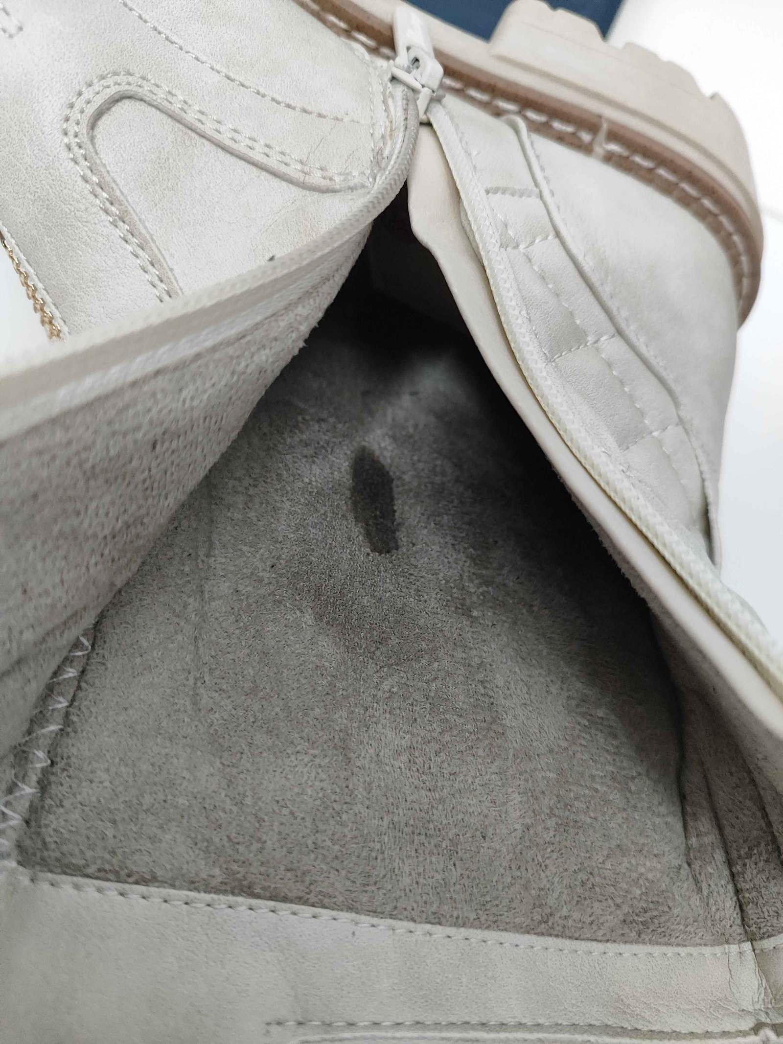 Są czyste, zadbane, podeszwy bez śladów zużycia. W lewym bucie drobna plama/sklejenie materiału wewnątrz cholewki (ok. 3×0,5 cm) – pokazane na zdjęciach i bez wpływu na wygodę. Zamek działa prawidłowo.