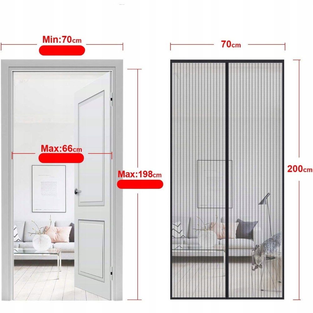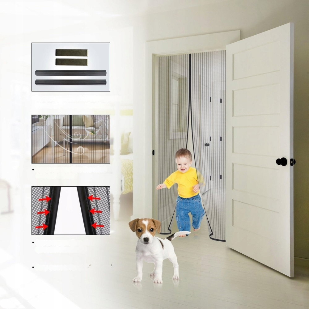 Dzięki 12 paskom magnetycznym i 14 silnym magnesom zasłony zamykają się cicho i szczelnie, nie pozostawiając szczelin. Nawet przy silnym wietrze moskitiera pozostaje na miejscu.
