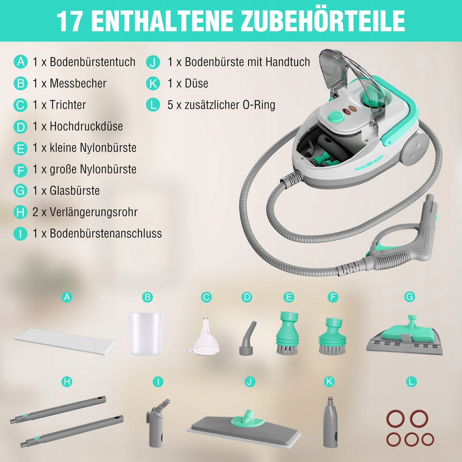 Zestaw zawiera bogaty pakiet 17 akcesoriów, które umożliwiają wszechstronne wykorzystanie parownicy: ściereczka do szczotki podłogowej, miarka, lejek, dysza wysokociśnieniowa, mała i duża szczotka nylonowa, szczotka do szyb, dwie rury przedłużające, złącze do szczotki podłogowej, szczotka podłogowa z ręcznikiem oraz dodatkowe uszczelki O-ring. Prosta obsługa i intuicyjne użytkowanie sprawiają, że porządki stają się przyjemnością. Zalecana pojemność wody to 0.5-1.2 litra. Do zbiornika należy wlewać wyłącznie czystą wodę.